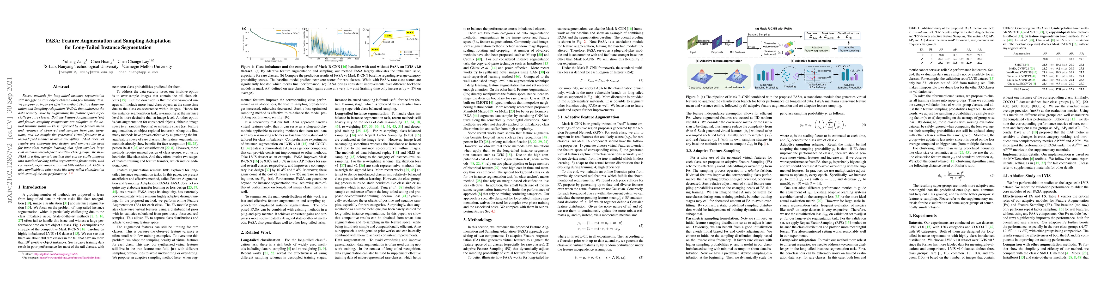 The paper proposes FASA, a method for long-tailed instance segmentation that tackles data scarcity for rare classes through feature augmentation and adaptive sampling. FASA enhances feature space for rare classes and avoids overfitting, demonstrating consistent performance gains with minimal additional cost.