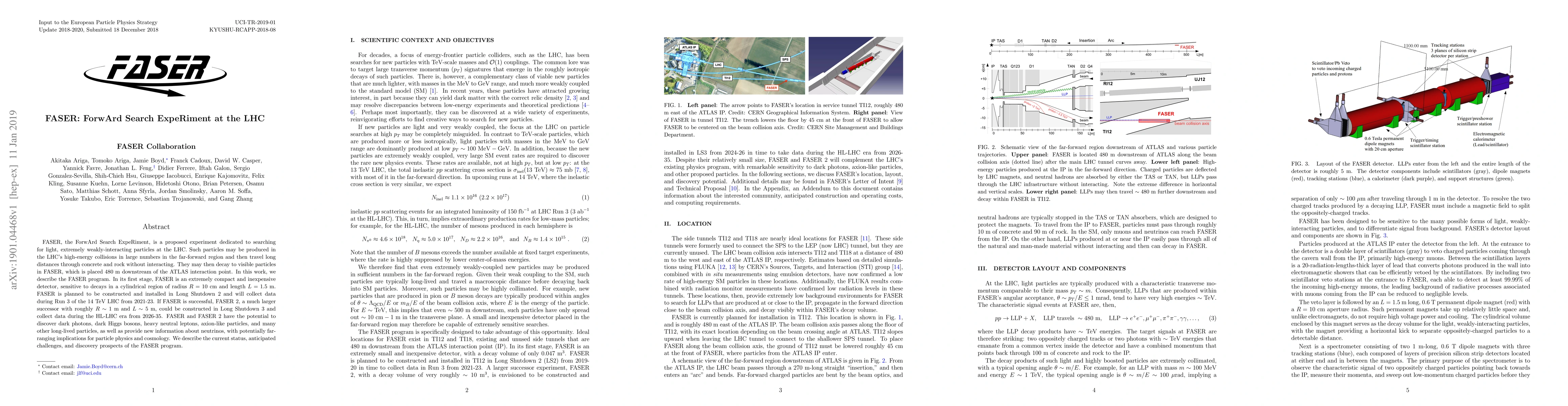 FASER is a proposed experiment at the LHC designed to detect light, weakly-interacting particles produced in high-energy collisions that travel long distances without interaction. The initial compact FASER detector aims to discover dark photons and other exotic particles, with plans for an expanded FASER 2 during the HL-LHC era.