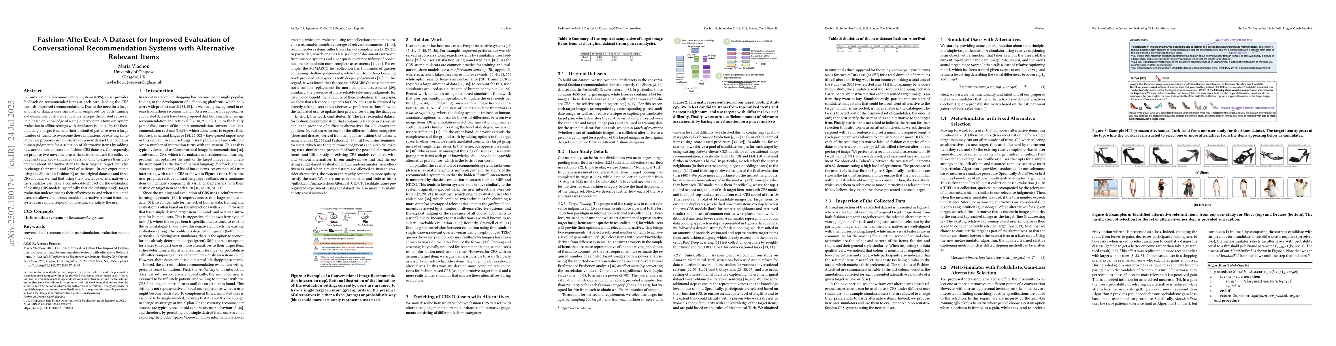 In Conversational Recommendation Systems (CRS), a user provides feedback on recommended items at each turn, leading the CRS towards improved recommendations. Due to the need for a large amount of data, a user simulator is employed for both training and evaluation. Such user simulators critique the current retrieved item based on knowledge of a single target item. However, system evaluation in offline settings with simulators is limited by the focus on a single target item and their unlimited patience over a large number of turns. To overcome these limitations of existing simulators, we propose Fashion-AlterEval, a new dataset that contains human judgments for a selection of alternative items by adding new annotations in common fashion CRS datasets. Consequently, we propose two novel meta-user simulators that use the collected judgments and allow simulated users not only to express their preferences about alternative items to their original target, but also to change their mind and level of patience. In our experiments using the Shoes and Fashion IQ as the original datasets and three CRS models, we find that using the knowledge of alternatives by the simulator can have a considerable impact on the evaluation of existing CRS models, specifically that the existing single-target evaluation underestimates their effectiveness, and when simulatedusers are allowed to instead consider alternative relevant items, the system can rapidly respond to more quickly satisfy the user.
