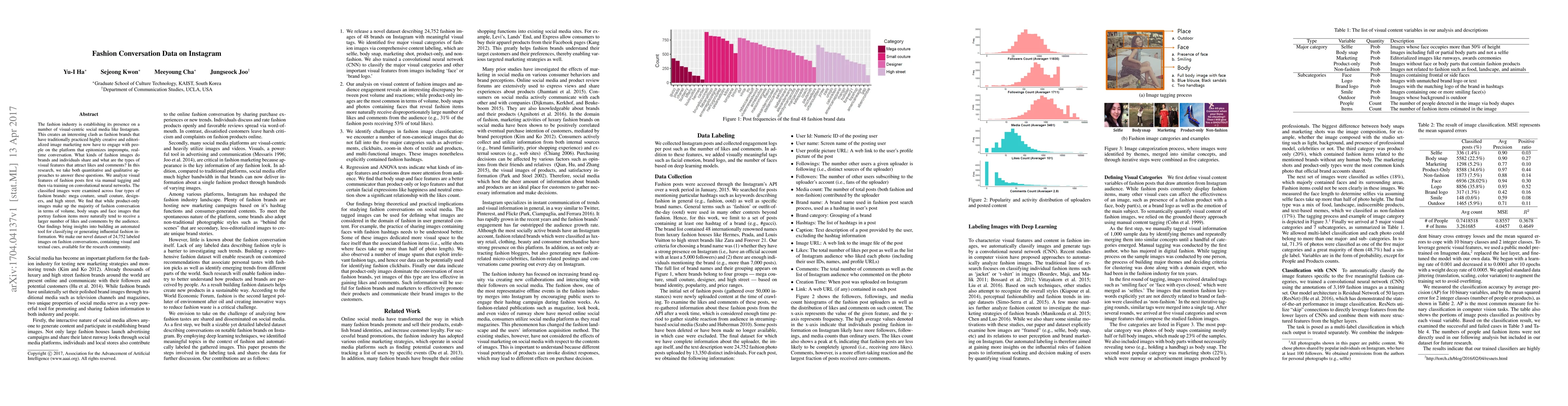 The fashion industry is establishing its presence on a number of visual-centric social media like Instagram. This creates an interesting clash as fashion brands that have traditionally practiced highly creative and editorialized image marketing now have to engage with people on the platform that epitomizes impromptu, realtime conversation. What kinds of fashion images do brands and individuals share and what are the types of visual features that attract likes and comments? In this research, we take both quantitative and qualitative approaches to answer these questions. We analyze visual features of fashion posts first via manual tagging and then via training on convolutional neural networks. The classified images were examined across four types of fashion brands: mega couture, small couture, designers, and high street. We find that while product-only images make up the majority of fashion conversation in terms of volume, body snaps and face images that portray fashion items more naturally tend to receive a larger number of likes and comments by the audience. Our findings bring insights into building an automated tool for classifying or generating influential fashion information. We make our novel dataset of {24,752} labeled images on fashion conversations, containing visual and textual cues, available for the research community.