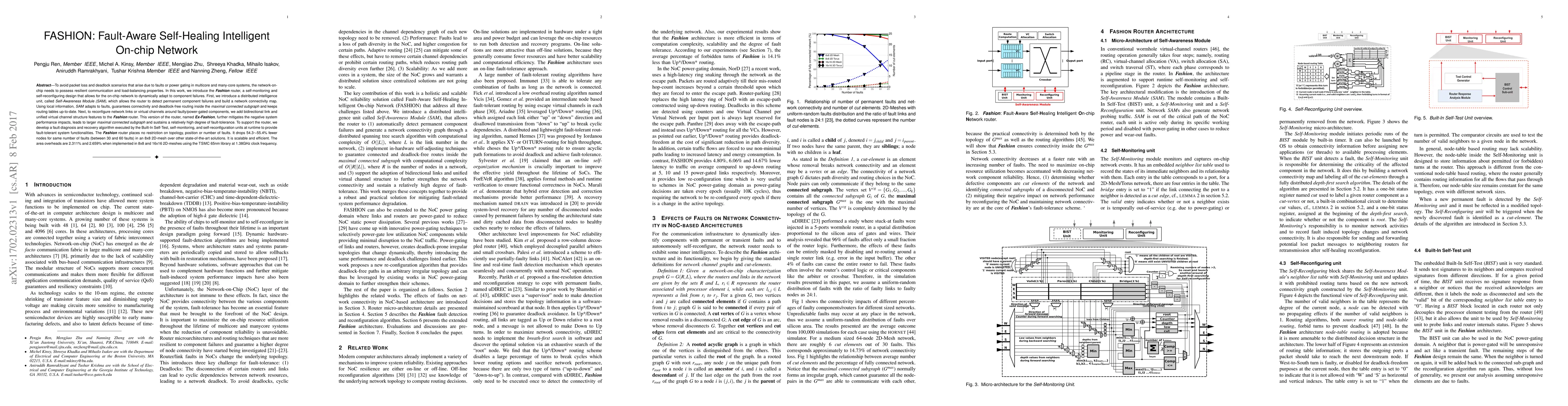 The Fashion router introduces a self-monitoring and self-reconfiguring on-chip network design to dynamically adapt to component failures, significantly reducing packet loss and deadlock scenarios. It achieves this through a Self-Awareness Module and a bidirectional link structure, leading to improved fault tolerance and scalability with minimal area overhead.