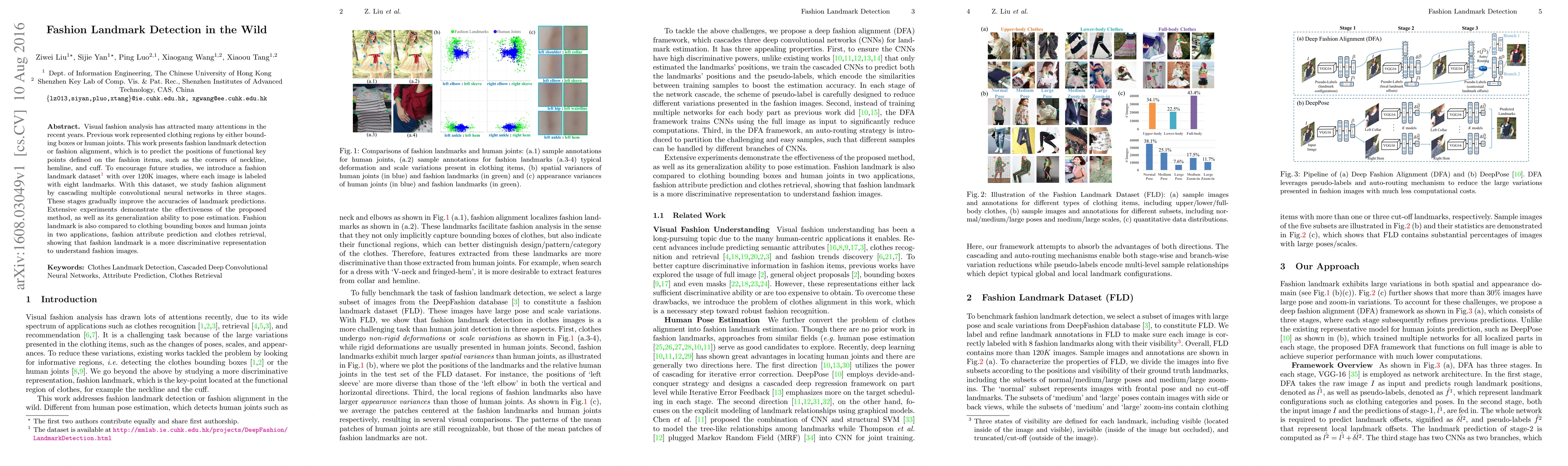 This paper introduces a method for fashion landmark detection to predict key points on clothing items, presenting a new dataset with over 120K labeled images. The proposed method uses a multi-stage convolutional neural network to improve landmark prediction accuracy, demonstrating its effectiveness and generalization for pose estimation.