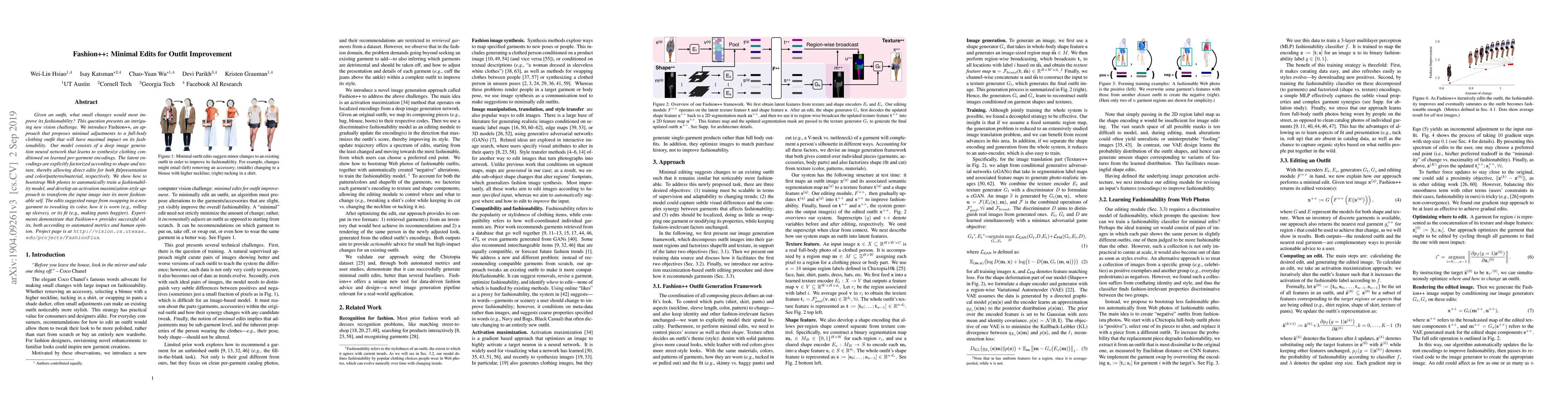 Given an outfit, what small changes would most improve its fashionability? This question presents an intriguing new vision challenge. We introduce Fashion++, an approach that proposes minimal adjustments to a full-body clothing outfit that will have maximal impact on its fashionability. Our model consists of a deep image generation neural network that learns to synthesize clothing conditioned on learned per-garment encodings. The latent encodings are explicitly factorized according to shape and texture, thereby allowing direct edits for both fit/presentation and color/patterns/material, respectively. We show how to bootstrap Web photos to automatically train a fashionability model, and develop an activation maximization-style approach to transform the input image into its more fashionable self. The edits suggested range from swapping in a new garment to tweaking its color, how it is worn (e.g., rolling up sleeves), or its fit (e.g., making pants baggier). Experiments demonstrate that Fashion++ provides successful edits, both according to automated metrics and human opinion. Project page is at http://vision.cs.utexas.edu/projects/FashionPlus.