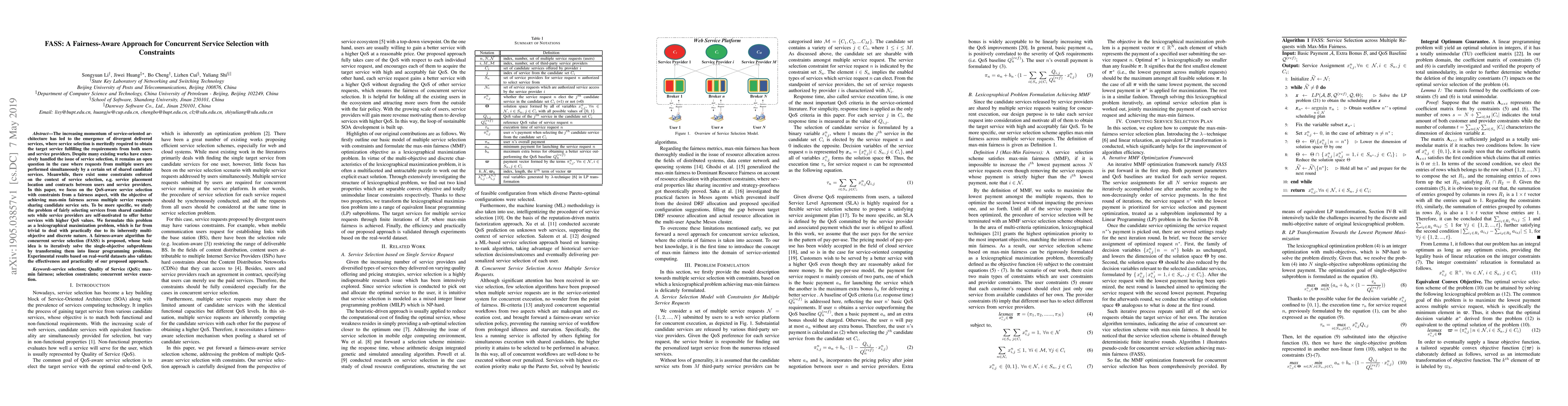 This paper proposes FASS, a fairness-aware algorithm for concurrent service selection under constraints, aiming to achieve max-min fairness across multiple service requests. The algorithm iteratively solves single-objective subproblems through linear programming, demonstrating effectiveness via real-world dataset experiments.
