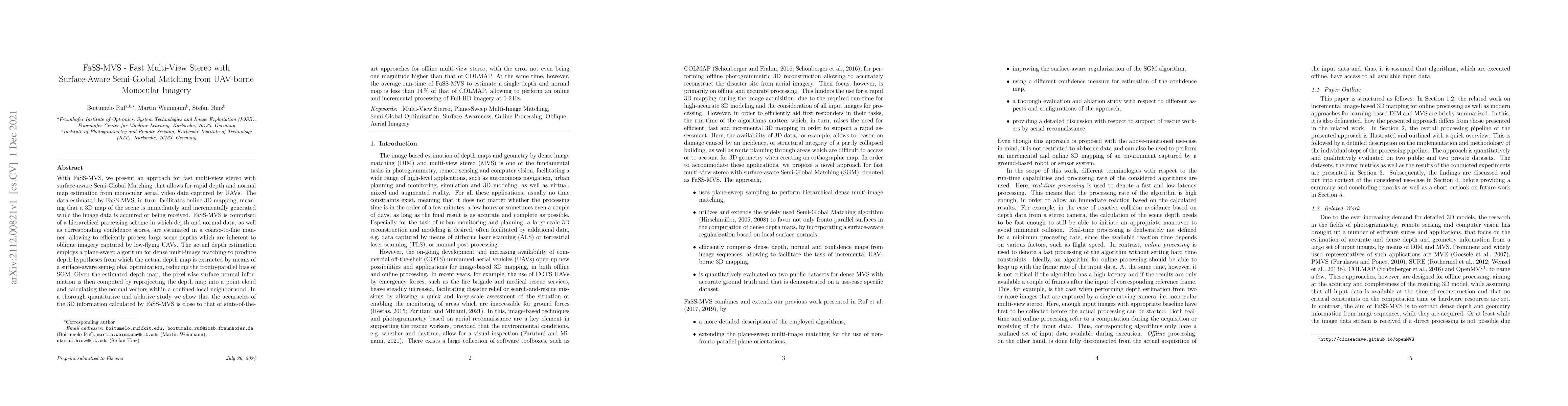 FaSS-MVS presents a fast multi-view stereo method for depth and normal map estimation from monocular UAV imagery, enabling real-time 3D mapping. The approach uses a hierarchical scheme and surface-aware semi-global matching, achieving near state-of-the-art accuracy while running significantly faster than existing methods.