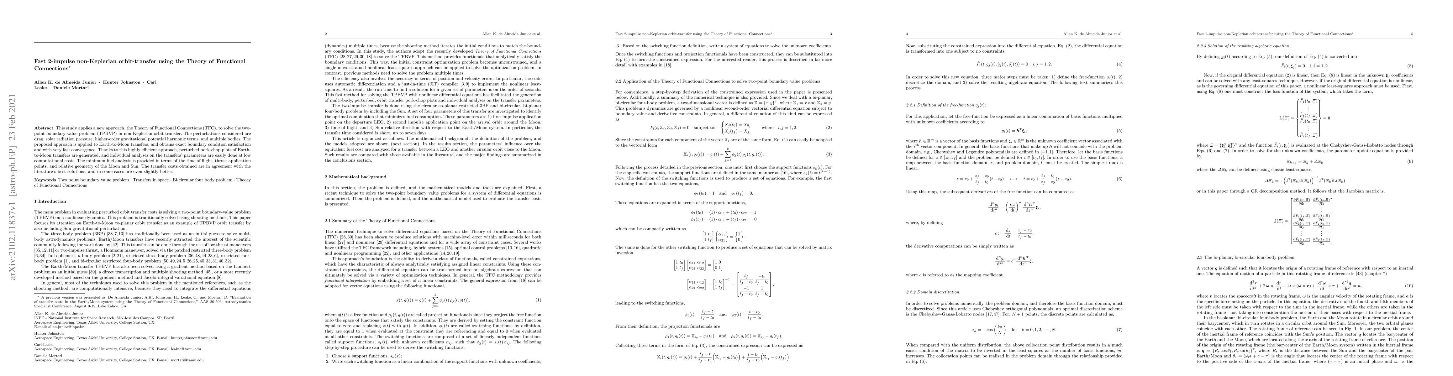 This paper introduces the Theory of Functional Connections (TFC) to achieve fast 2-impulse non-Keplerian orbit transfers, considering perturbations like drag and solar radiation. The method demonstrates efficient convergence and low computational costs, yielding competitive transfer costs for Earth-to-Moon missions.