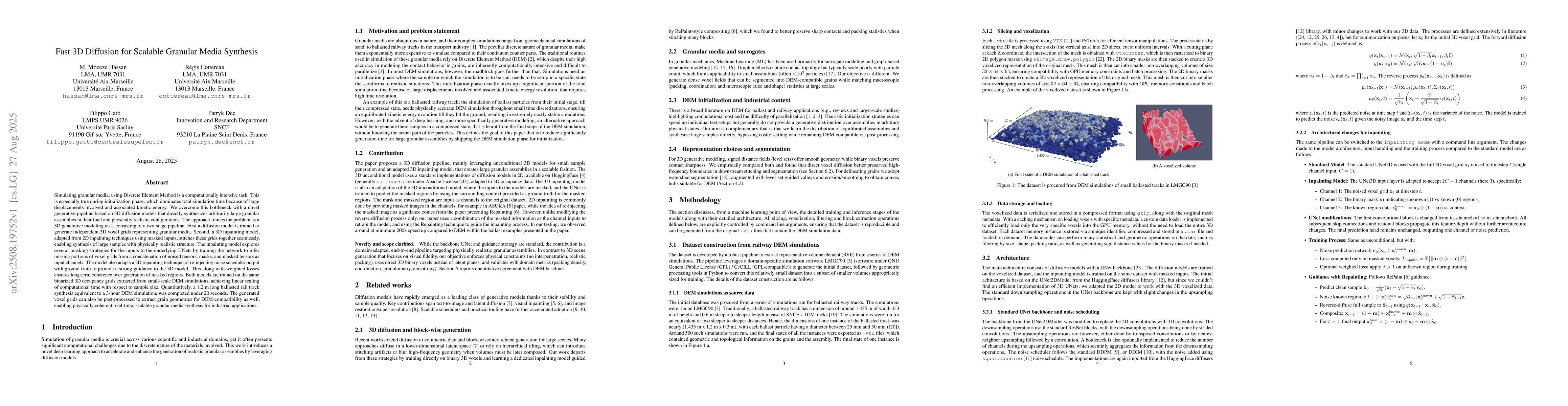 Simulating granular media, using Discrete Element Method is a computationally intensive task. This is especially true during initialization phase, which dominates total simulation time because of large displacements involved and associated kinetic energy. We overcome this bottleneck with a novel generative pipeline based on 3D diffusion models that directly synthesizes arbitrarily large granular assemblies in their final and physically realistic configurations. The approach frames the problem as a 3D generative modeling task, consisting of a two-stage pipeline. First a diffusion model is trained to generate independent 3D voxel grids representing granular media. Second, a 3D inpainting model, adapted from 2D inpainting techniques using masked inputs, stitches these grids together seamlessly, enabling synthesis of large samples with physically realistic structure. The inpainting model explores several masking strategies for the inputs to the underlying UNets by training the network to infer missing portions of voxel grids from a concatenation of noised tensors, masks, and masked tensors as input channels. The model also adapts a 2D repainting technique of re-injecting noise scheduler output with ground truth to provide a strong guidance to the 3D model. This along with weighted losses ensures long-term coherence over generation of masked regions. Both models are trained on the same binarized 3D occupancy grids extracted from small-scale DEM simulations, achieving linear scaling of computational time with respect to sample size. Quantitatively, a 1.2 m long ballasted rail track synthesis equivalent to a 3-hour DEM simulation, was completed under 20 seconds. The generated voxel grids can also be post-processed to extract grain geometries for DEM-compatibility as well, enabling physically coherent, real-time, scalable granular media synthesis for industrial applications.