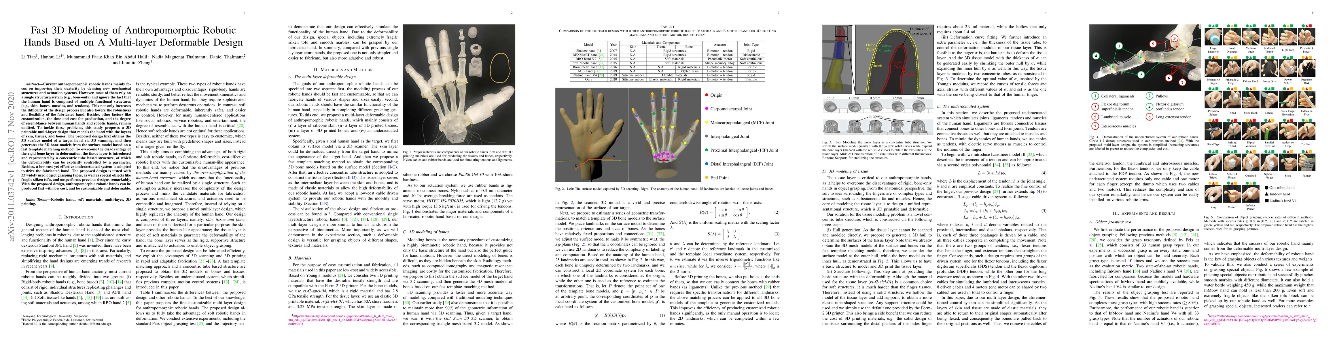 This paper proposes a fast, 3D printable multi-layer design for anthropomorphic robotic hands that models skin, tissues, and bones, improving flexibility and resemblance to human hands. The design uses 3D scanning and template matching, and a deformable tissue layer to enhance deformability, achieving better performance in grasping tests compared to previous designs.