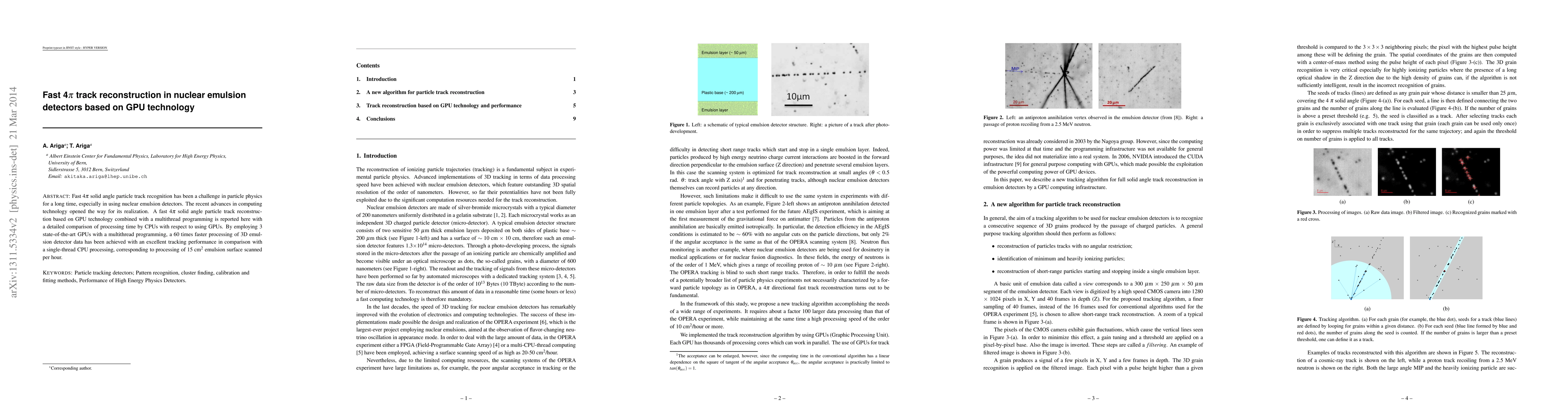 Fast 4$\pi$ solid angle particle track recognition has been a challenge in particle physics for a long time, especially in using nuclear emulsion detectors. The recent advances in computing technology opened the way for its realization. A fast 4$\pi$ solid angle particle track reconstruction based on GPU technology combined with a multithread programming is reported here with a detailed comparison between GPU-based and CPU-based programming. A 60 times faster processing of 3D emulsion detector data, corresponding to processing of 15 cm$^2$ emulsion surface scanned per hour, has been achieved by GPUs with an excellent tracking performance.