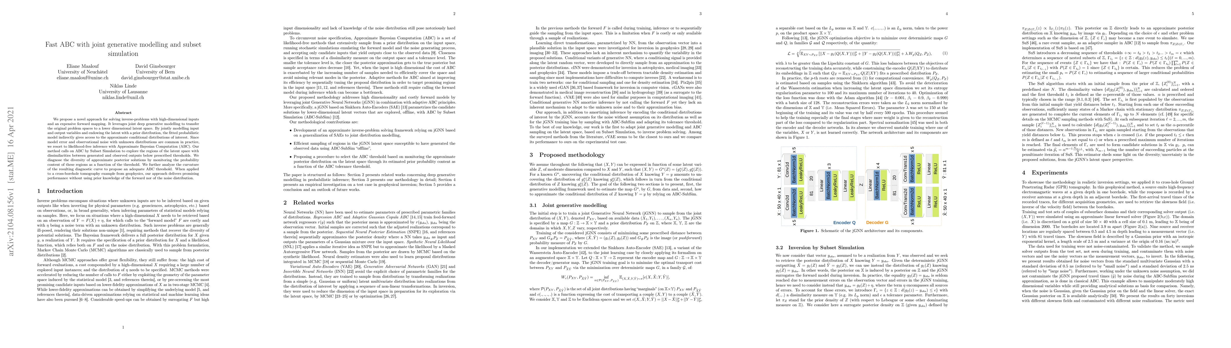 We propose a novel approach for solving inverse-problems with high-dimensional inputs and an expensive forward mapping. It leverages joint deep generative modelling to transfer the original problem spaces to a lower dimensional latent space. By jointly modelling input and output variables and endowing the latent with a prior distribution, the fitted probabilistic model indirectly gives access to the approximate conditional distributions of interest. Since model error and observational noise with unknown distributions are common in practice, we resort to likelihood-free inference with Approximate Bayesian Computation (ABC). Our method calls on ABC by Subset Simulation to explore the regions of the latent space with dissimilarities between generated and observed outputs below prescribed thresholds. We diagnose the diversity of approximate posterior solutions by monitoring the probability content of these regions as a function of the threshold. We further analyze the curvature of the resulting diagnostic curve to propose an adequate ABC threshold. When applied to a cross-borehole tomography example from geophysics, our approach delivers promising performance without using prior knowledge of the forward nor of the noise distribution.