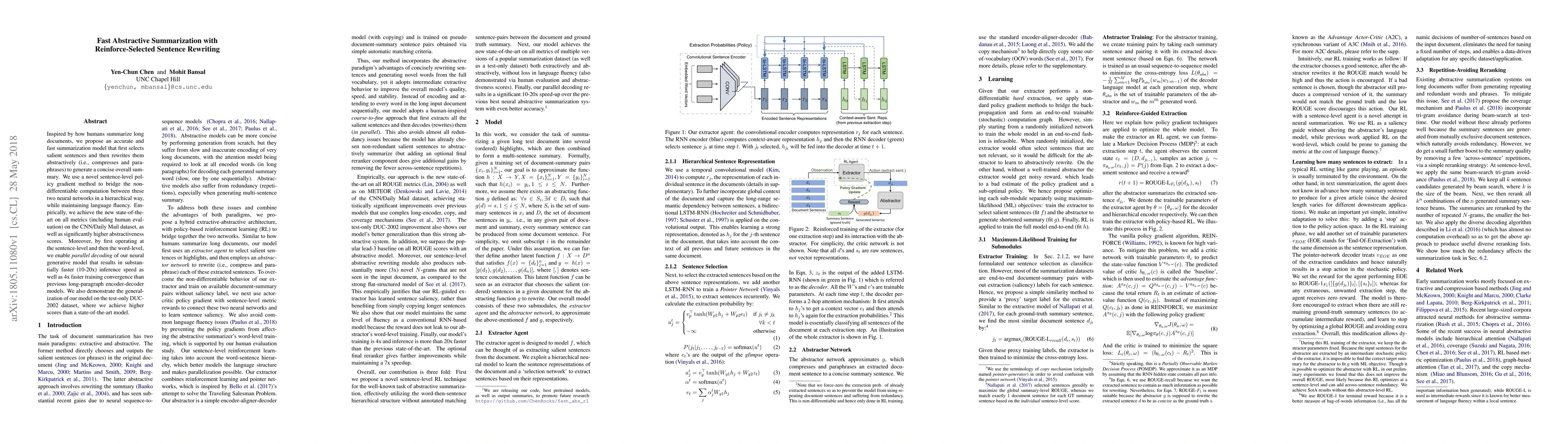 Inspired by how humans summarize long documents, we propose an accurate and fast summarization model that first selects salient sentences and then rewrites them abstractively (i.e., compresses and paraphrases) to generate a concise overall summary. We use a novel sentence-level policy gradient method to bridge the non-differentiable computation between these two neural networks in a hierarchical way, while maintaining language fluency. Empirically, we achieve the new state-of-the-art on all metrics (including human evaluation) on the CNN/Daily Mail dataset, as well as significantly higher abstractiveness scores. Moreover, by first operating at the sentence-level and then the word-level, we enable parallel decoding of our neural generative model that results in substantially faster (10-20x) inference speed as well as 4x faster training convergence than previous long-paragraph encoder-decoder models. We also demonstrate the generalization of our model on the test-only DUC-2002 dataset, where we achieve higher scores than a state-of-the-art model.