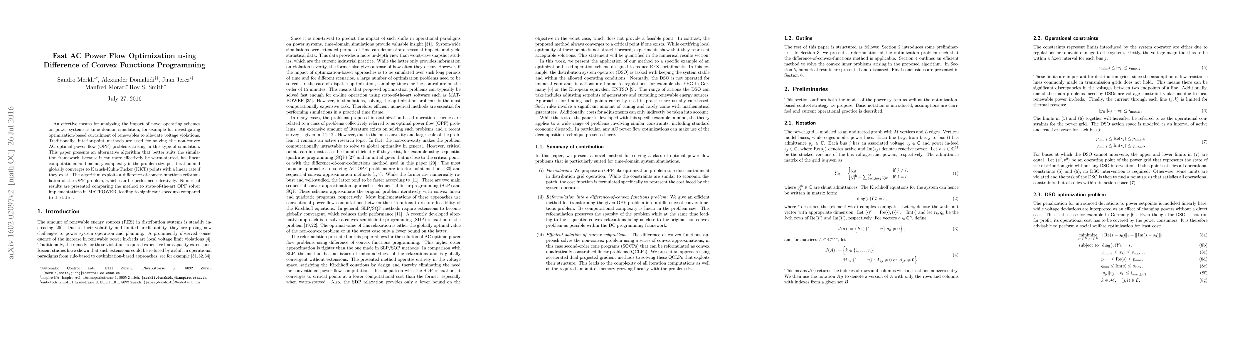 An effective means for analyzing the impact of novel operating schemes on power systems is time domain simulation, for example for investigating optimization-based curtailment of renewables to alleviate voltage violations. Traditionally, interior-point methods are used for solving the non-convex AC optimal power flow (OPF) problems arising in this type of simulation. This paper presents an alternative algorithm that better suits the simulation framework, because it can more effectively be warm-started, has linear computational and memory complexity in the problem size per iteration and globally converges to Karush-Kuhn-Tucker (KKT) points with a linear rate if they exist. The algorithm exploits a difference-of-convex-functions reformulation of the OPF problem, which can be performed effectively. Numerical results are presented comparing the method to state-of-the-art OPF solver implementations in MATPOWER, leading to significant speedups compared to the latter.