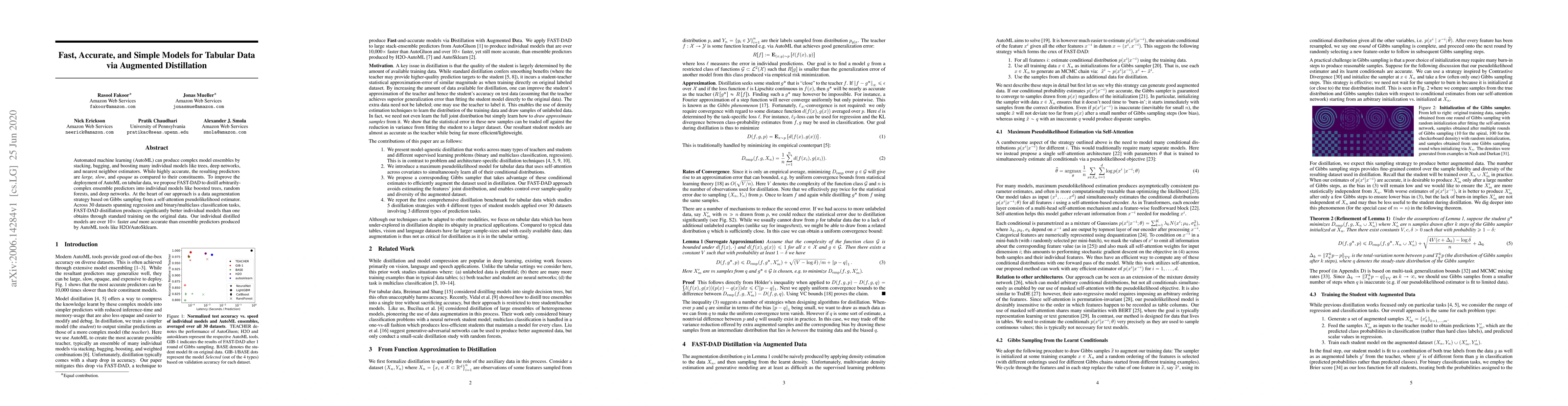 The paper proposes FAST-DAD, a method for distilling complex ensemble predictors into individual models like boosted trees, random forests, and deep networks using data augmentation based on Gibbs sampling from a self-attention pseudolikelihood estimator.