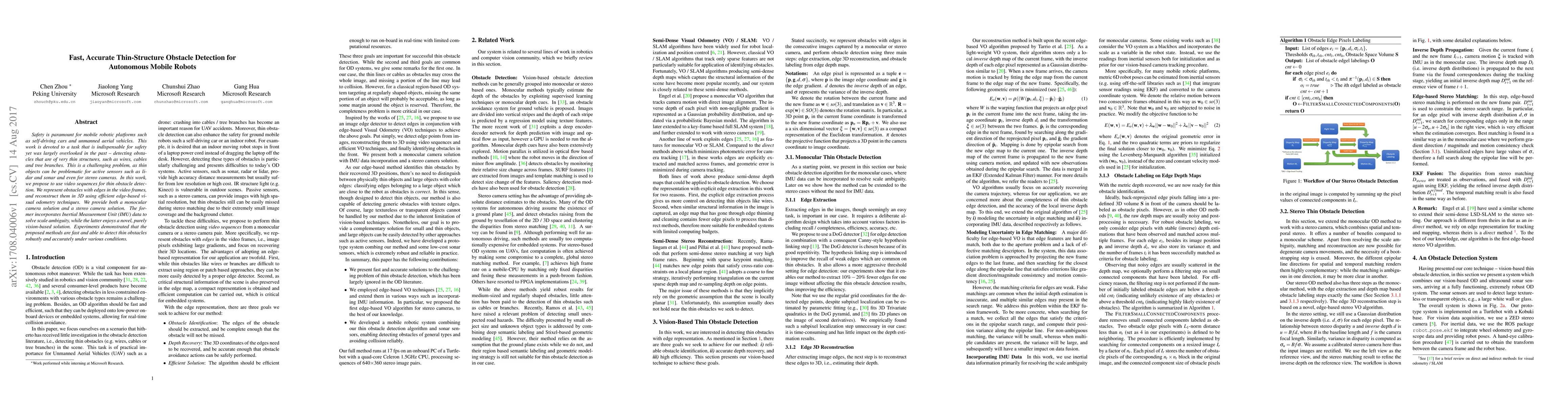 Safety is paramount for mobile robotic platforms such as self-driving cars and unmanned aerial vehicles. This work is devoted to a task that is indispensable for safety yet was largely overlooked in the past -- detecting obstacles that are of very thin structures, such as wires, cables and tree branches. This is a challenging problem, as thin objects can be problematic for active sensors such as lidar and sonar and even for stereo cameras. In this work, we propose to use video sequences for thin obstacle detection. We represent obstacles with edges in the video frames, and reconstruct them in 3D using efficient edge-based visual odometry techniques. We provide both a monocular camera solution and a stereo camera solution. The former incorporates Inertial Measurement Unit (IMU) data to solve scale ambiguity, while the latter enjoys a novel, purely vision-based solution. Experiments demonstrated that the proposed methods are fast and able to detect thin obstacles robustly and accurately under various conditions.
