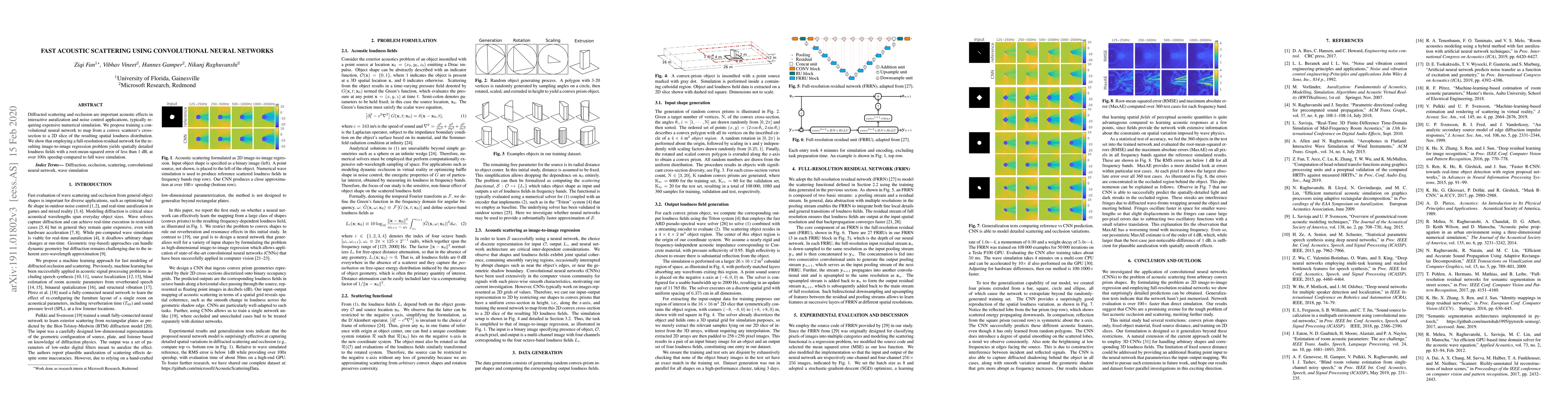 This paper proposes using a convolutional neural network to rapidly simulate acoustic scattering and occlusion effects, achieving over 100x speedup compared to traditional numerical simulations while maintaining high accuracy. The network maps scatterer cross-sections to spatial loudness distributions with less than 1 dB error.
