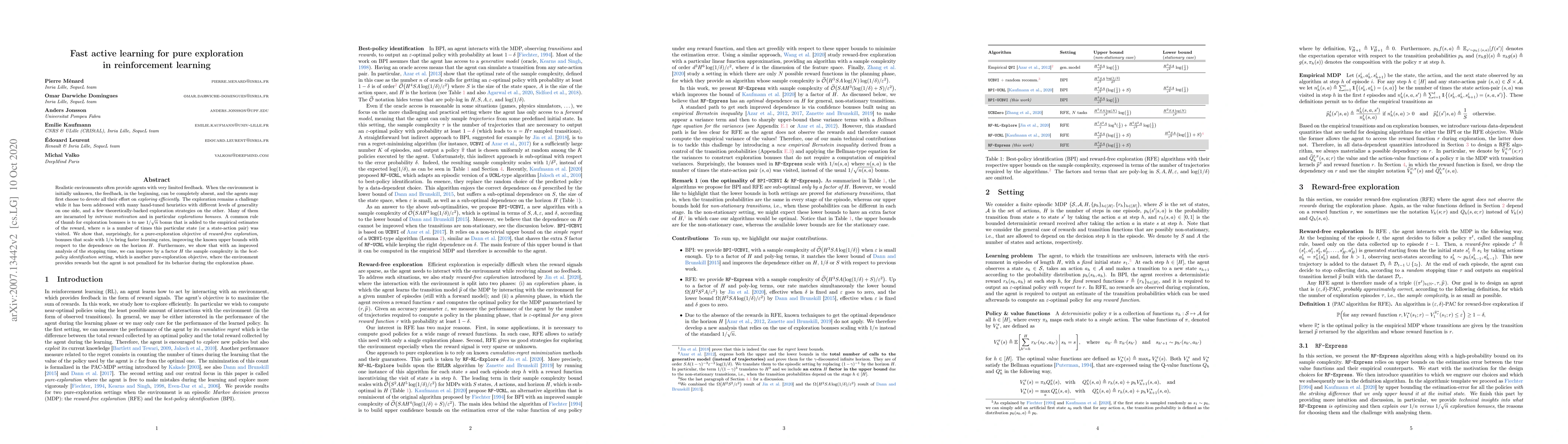 Realistic environments often provide agents with very limited feedback. When the environment is initially unknown, the feedback, in the beginning, can be completely absent, and the agents may first choose to devote all their effort on exploring efficiently. The exploration remains a challenge while it has been addressed with many hand-tuned heuristics with different levels of generality on one side, and a few theoretically-backed exploration strategies on the other. Many of them are incarnated by intrinsic motivation and in particular explorations bonuses. A common rule of thumb for exploration bonuses is to use $1/\sqrt{n}$ bonus that is added to the empirical estimates of the reward, where $n$ is a number of times this particular state (or a state-action pair) was visited. We show that, surprisingly, for a pure-exploration objective of reward-free exploration, bonuses that scale with $1/n$ bring faster learning rates, improving the known upper bounds with respect to the dependence on the horizon $H$. Furthermore, we show that with an improved analysis of the stopping time, we can improve by a factor $H$ the sample complexity in the best-policy identification setting, which is another pure-exploration objective, where the environment provides rewards but the agent is not penalized for its behavior during the exploration phase.