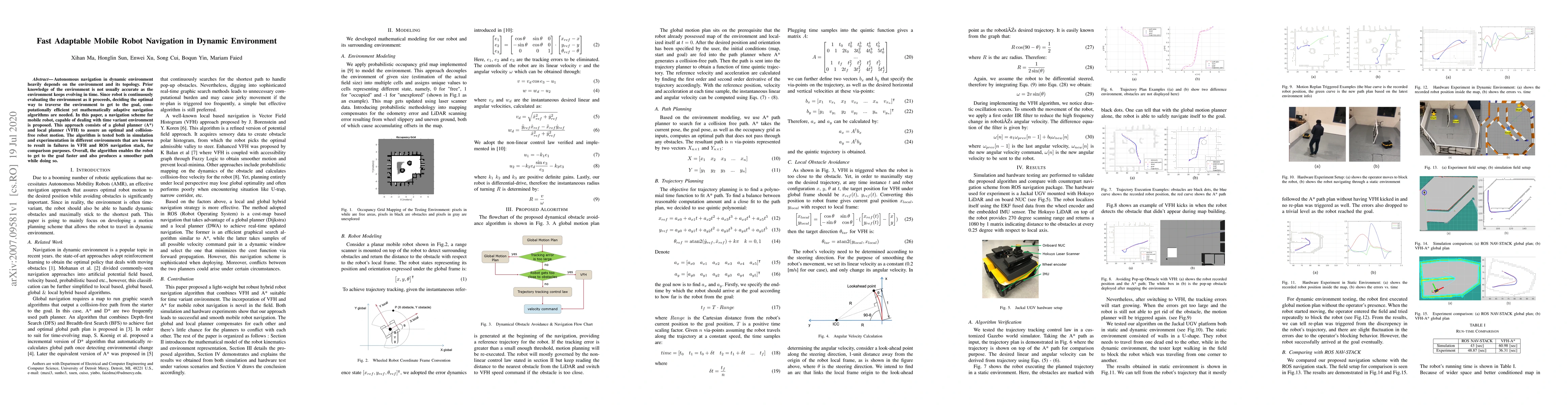 This paper proposes a navigation scheme for mobile robots that combines a global A* planner with a local VFH planner to efficiently navigate dynamic environments. The algorithm was tested both in simulations and real-world experiments, demonstrating faster and smoother pathfinding compared to existing methods.