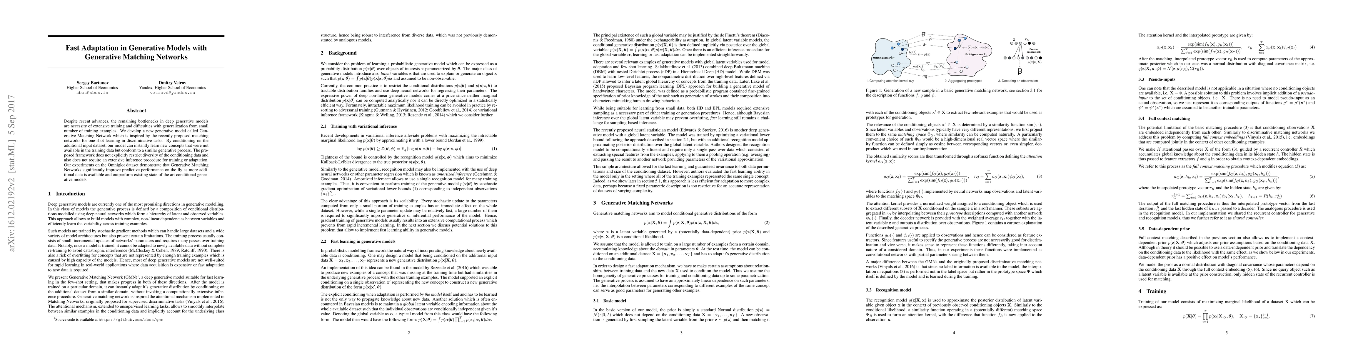 This paper introduces Generative Matching Networks, a generative model designed to rapidly adapt to new concepts with minimal training, inspired by matching networks for one-shot learning. The model demonstrates superior performance on the Omniglot dataset, showing significant improvement in predictive accuracy as more data becomes available.