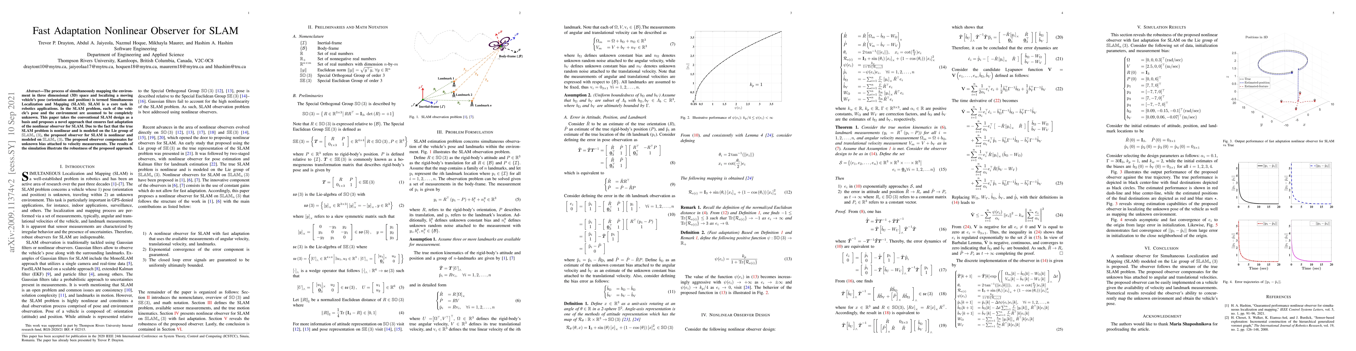 Researchers propose a novel SLAM observer that adapts quickly to changing environments, addressing nonlinearity and bias in velocity measurements. The approach demonstrates robustness through simulation results.
