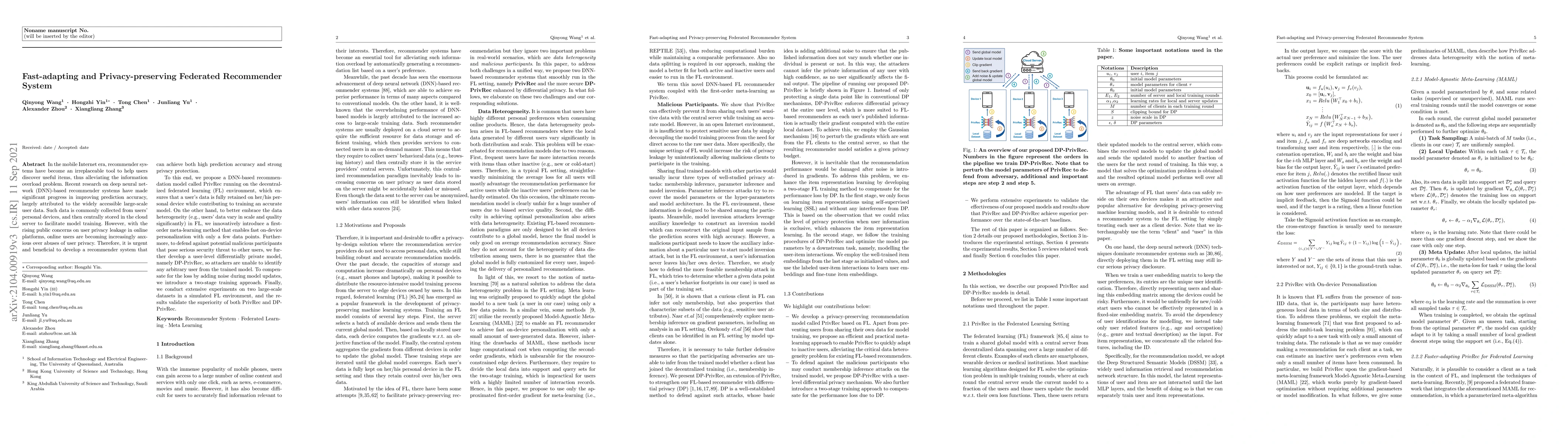 This paper proposes PrivRec, a fast-adapting and privacy-preserving federated recommender system using decentralized federated learning to keep user data local. It introduces a first-order meta-learning method for quick personalization and a differentially private model to protect against malicious participants, achieving high prediction accuracy while safeguarding user privacy.