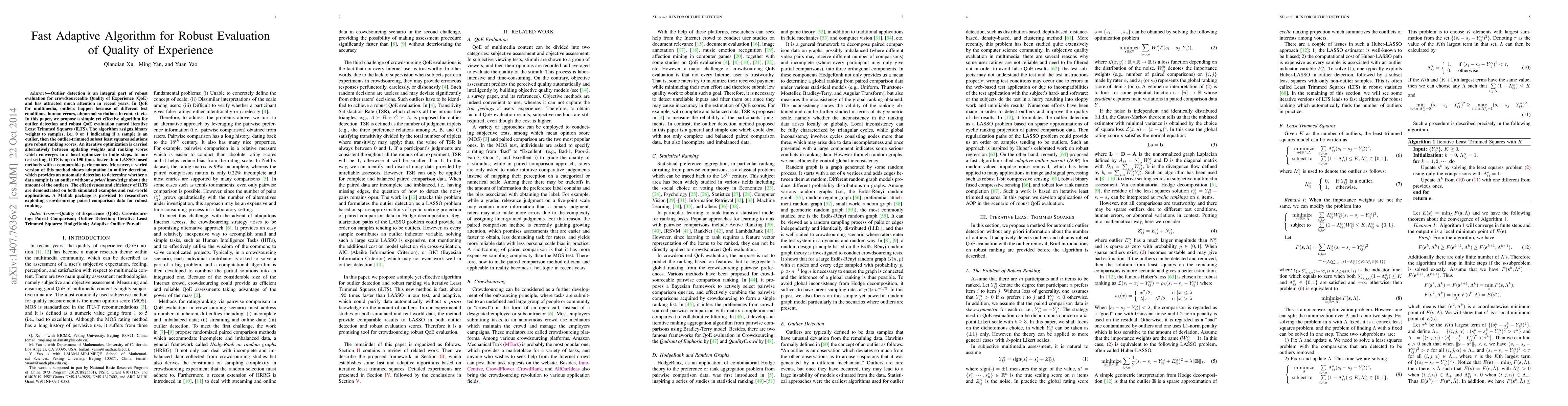 Outlier detection is an integral part of robust evaluation for crowdsourceable Quality of Experience (QoE) and has attracted much attention in recent years. In QoE for multimedia, outliers happen because of different test conditions, human errors, abnormal variations in context, {etc}. In this paper, we propose a simple yet effective algorithm for outlier detection and robust QoE evaluation named iterative Least Trimmed Squares (iLTS). The algorithm assigns binary weights to samples, i.e., 0 or 1 indicating if a sample is an outlier, then the outlier-trimmed subset least squares solutions give robust ranking scores. An iterative optimization is carried alternatively between updating weights and ranking scores which converges to a local optimizer in finite steps. In our test setting, iLTS is up to 190 times faster than LASSO-based methods with a comparable performance. Moreover, a varied version of this method shows adaptation in outlier detection, which provides an automatic detection to determine whether a data sample is an outlier without \emph{a priori} knowledge about the amount of the outliers. The effectiveness and efficiency of iLTS are demonstrated on both simulated examples and real-world applications. A Matlab package is provided to researchers exploiting crowdsourcing paired comparison data for robust ranking.