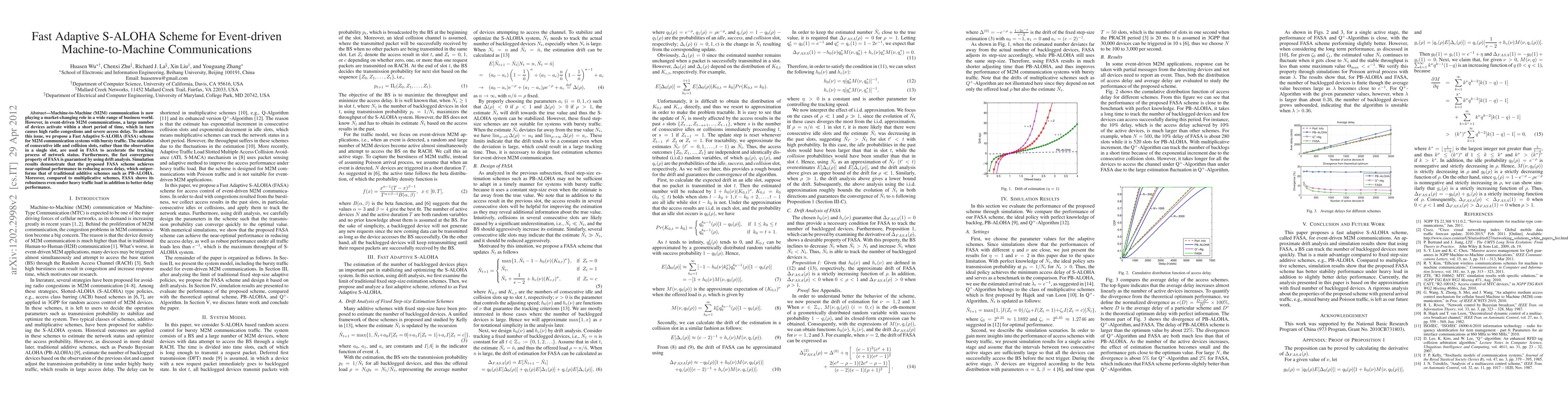 The paper proposes a Fast Adaptive S-ALOHA (FASA) scheme to mitigate congestion and access delay in event-driven Machine-to-Machine (M2M) communications. FASA uses statistics from consecutive idle and collision slots to quickly adapt to network conditions, demonstrating near-optimal performance and robustness over traditional and multiplicative schemes.