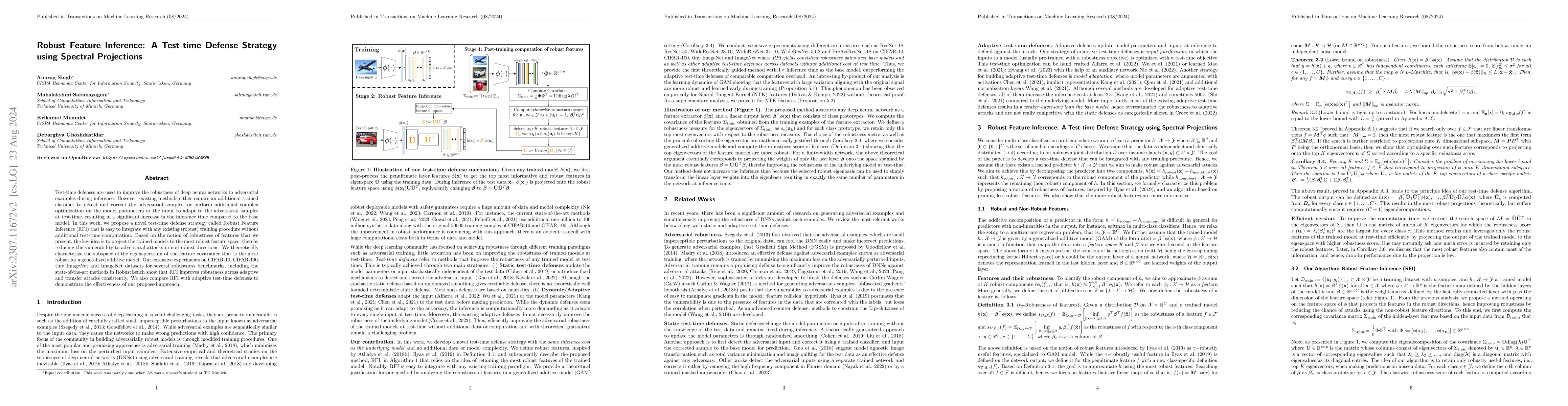 This paper proposes a novel adaptive test-time defense strategy that enhances the robustness of deep neural networks against adversarial attacks without increasing inference time. The method projects models to the most robust feature space, leveraging the top eigenspace of the feature matrix, and demonstrates superior performance compared to existing methods on CIFAR-10 and CIFAR-100 datasets.