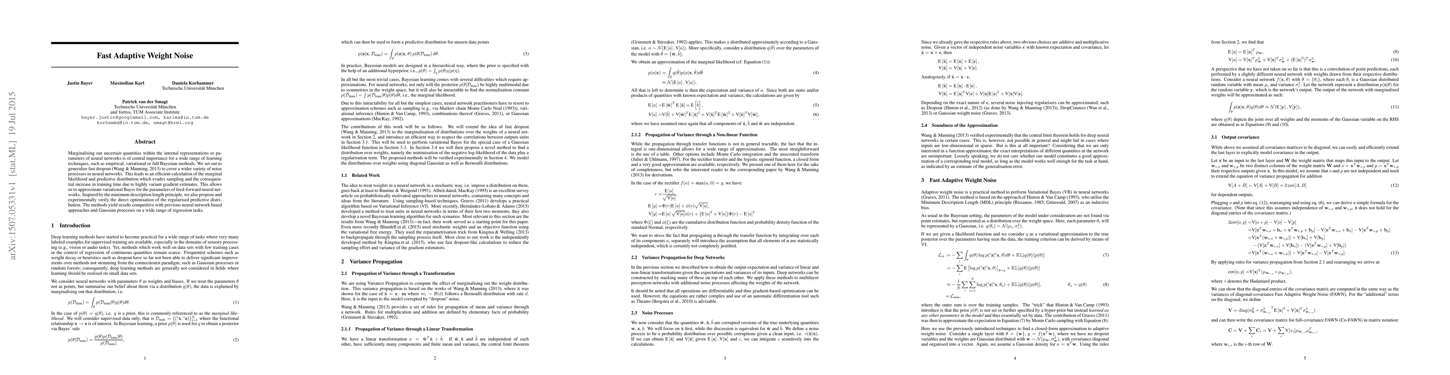 Marginalising out uncertain quantities within the internal representations or parameters of neural networks is of central importance for a wide range of learning techniques, such as empirical, variational or full Bayesian methods. We set out to generalise fast dropout (Wang & Manning, 2013) to cover a wider variety of noise processes in neural networks. This leads to an efficient calculation of the marginal likelihood and predictive distribution which evades sampling and the consequential increase in training time due to highly variant gradient estimates. This allows us to approximate variational Bayes for the parameters of feed-forward neural networks. Inspired by the minimum description length principle, we also propose and experimentally verify the direct optimisation of the regularised predictive distribution. The methods yield results competitive with previous neural network based approaches and Gaussian processes on a wide range of regression tasks.