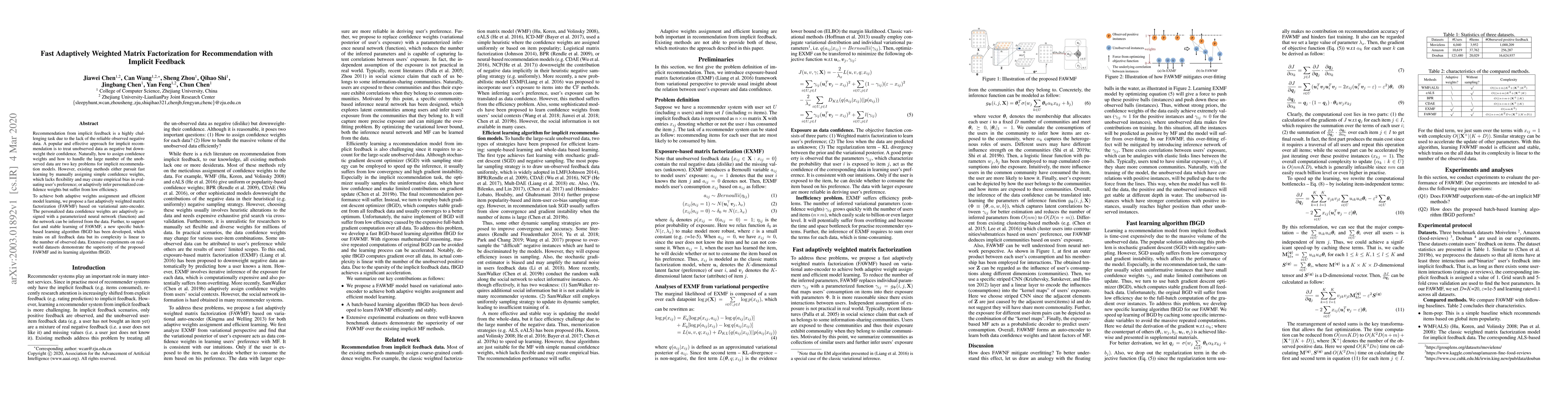 The paper proposes a fast adaptively weighted matrix factorization (FAWMF) method for recommendation systems using implicit feedback, addressing the challenge of assigning confidence weights to unobserved data. The FAWMF leverages a variational auto-encoder to adaptively infer personalized weights and introduces a new batch-based learning algorithm fBGD for efficient model training, demonstrating superior performance on real-world datasets.
