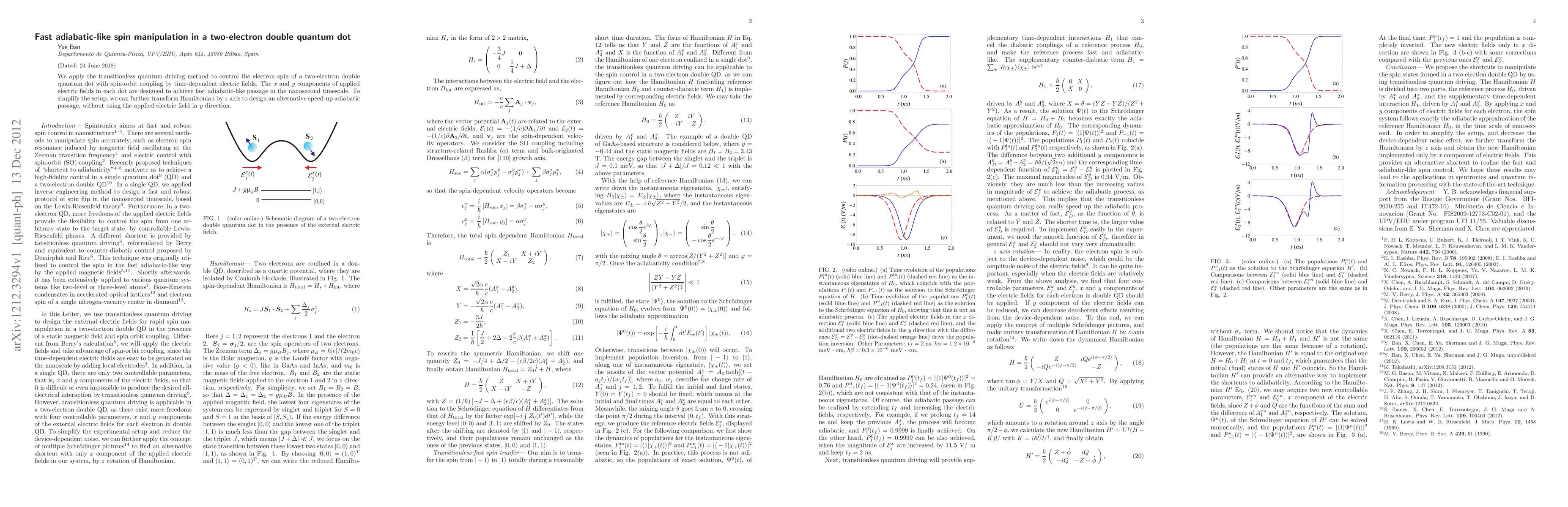Summary: Researchers utilize the transitionless quantum driving method to manipulate the spin of electrons in a double quantum dot via time-dependent electric fields, achieving rapid adiabatic-like spin control in nanoseconds, with an alternative simplified approach that omits $y$-axis fields.