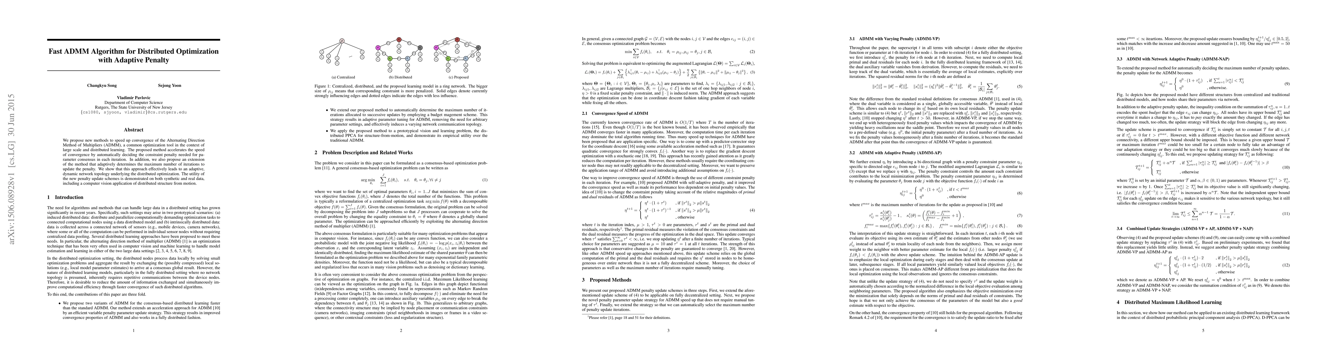 The paper proposes a fast ADMM algorithm that enhances convergence speed through adaptive penalty selection and iteration count, demonstrating effectiveness in distributed optimization with applications in computer vision. The method dynamically adjusts network topology and shows promising results on both synthetic and real datasets.