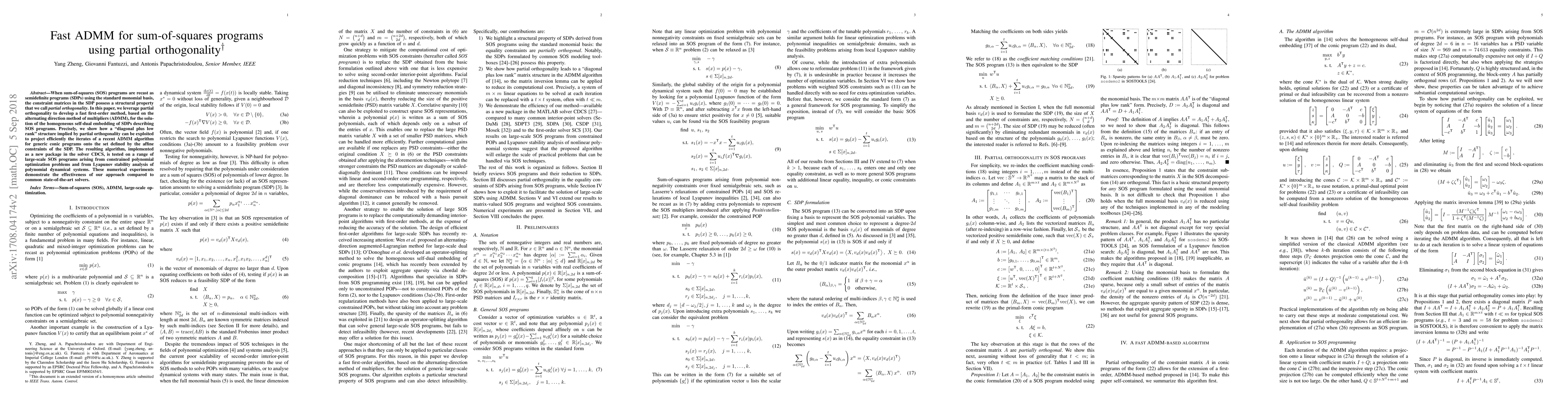 This paper proposes a fast first-order ADMM method for solving sum-of-squares programs by leveraging the partial orthogonality of constraint matrices in semidefinite programs. The method efficiently projects iterates onto affine constraints, demonstrating superior performance on large-scale polynomial optimization problems and stability analysis.