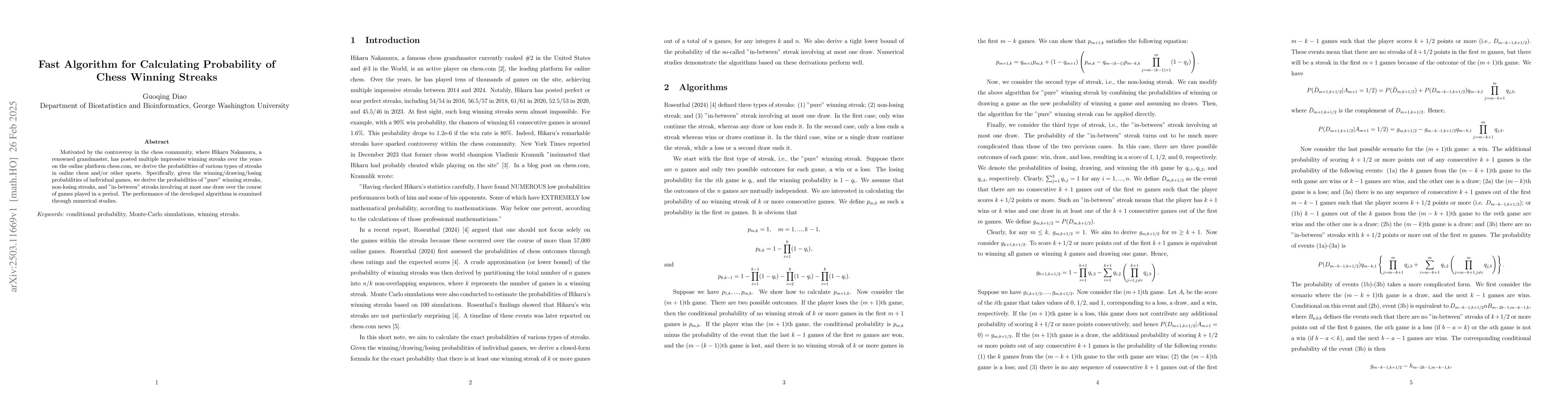 This paper develops a fast algorithm to calculate the probabilities of various winning streaks in chess, including pure winning streaks, non-losing streaks, and streaks with at most one draw. The algorithm's performance is validated through numerical studies, addressing the interest sparked by grandmaster Hikaru Nakamura's impressive online winning streaks.