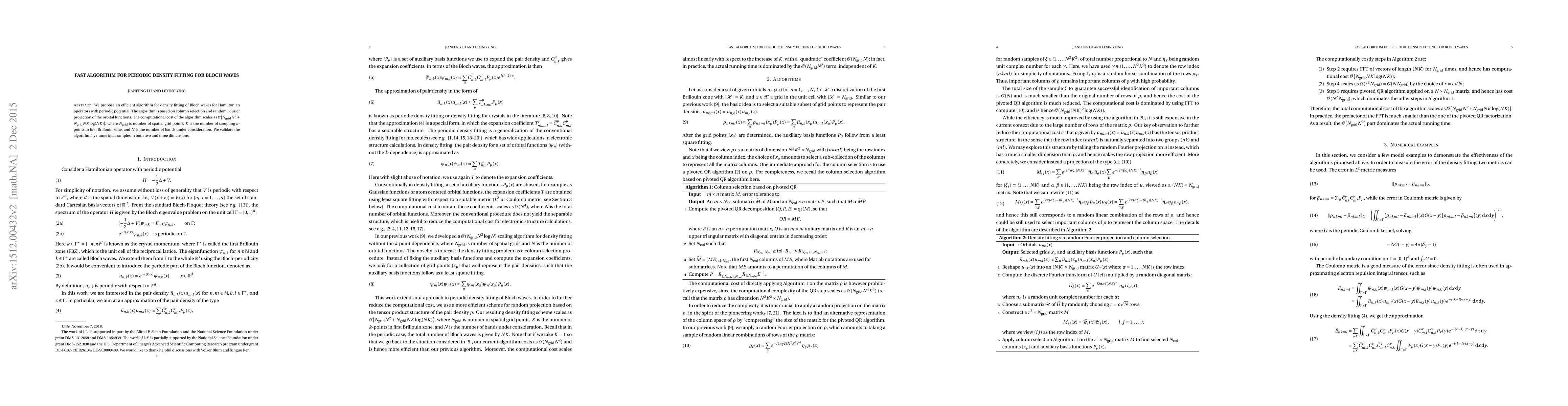 This paper introduces a fast algorithm for density fitting of Bloch waves in Hamiltonian operators with periodic potentials, utilizing column selection and random Fourier projection. The algorithm's computational cost scales efficiently with $\mathcal{O}\bigl(N_{\text{grid}} N^2 + N_{\text{grid}} NK \log (NK)\bigr)$, validated through numerical examples in two and three dimensions.