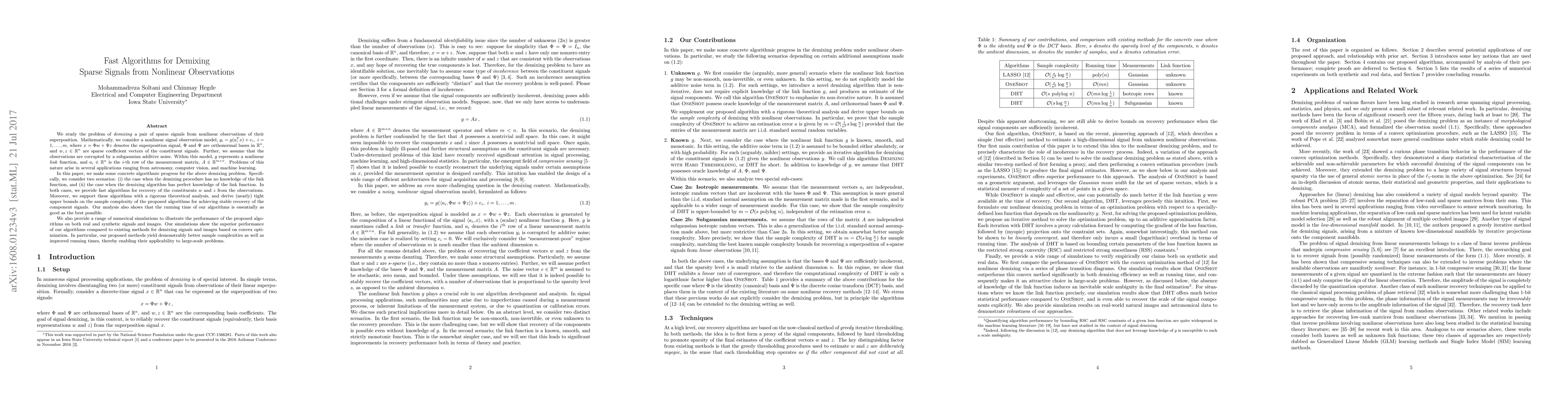 This paper proposes fast algorithms for demixing sparse signals from noisy, nonlinear observations, addressing two scenarios: one with unknown link functions and one with known link functions. The authors provide theoretical analysis and numerical simulations to demonstrate the effectiveness of their algorithms in recovering constituent signals.