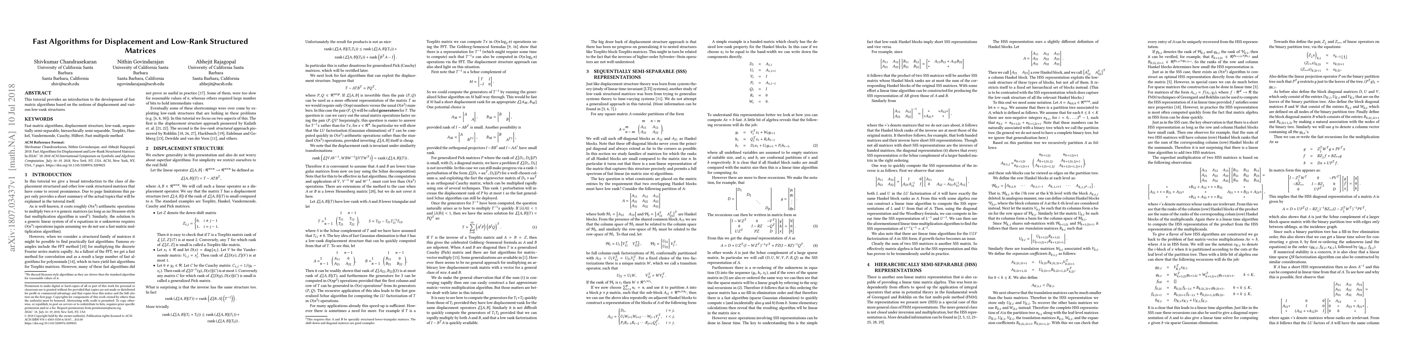 Summary: This tutorial explores the creation of efficient algorithms for matrix computations leveraging displacement and low-rank structures, aiming to enhance computational speed and performance.