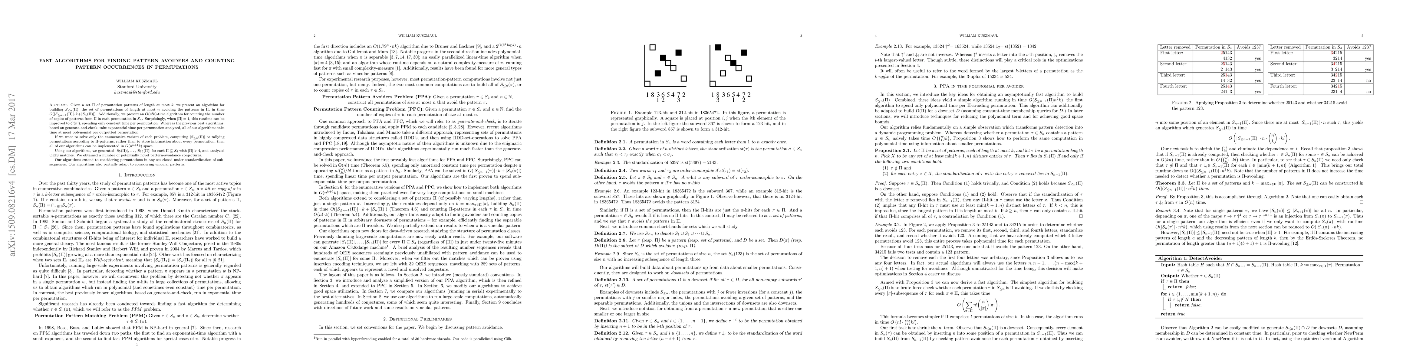 This paper presents efficient algorithms for constructing sets of permutations that avoid given patterns and for counting pattern occurrences in permutations, achieving polynomial time per permutation compared to previous exponential methods. The algorithms also offer space-efficient implementations for enumerative variants.