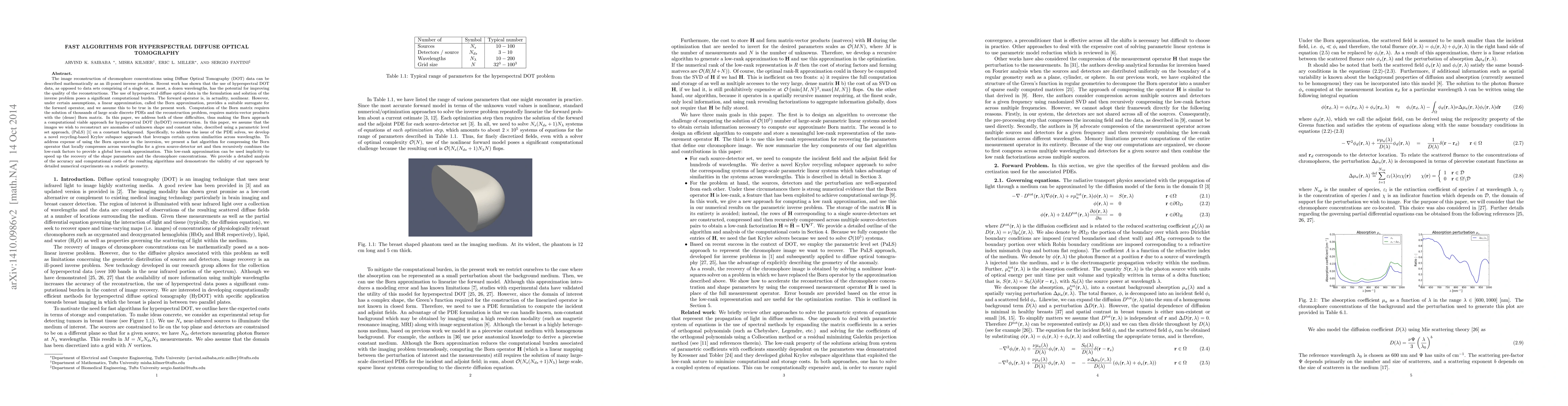 This paper proposes fast algorithms to tackle the computational challenges in reconstructing hyperspectral Diffuse Optical Tomography (DOT) data. It introduces a recycling-based Krylov subspace method to efficiently solve large-scale PDEs and a fast algorithm for compressing the Born operator to speed up inversion, enabling practical hyperspectral DOT reconstructions.