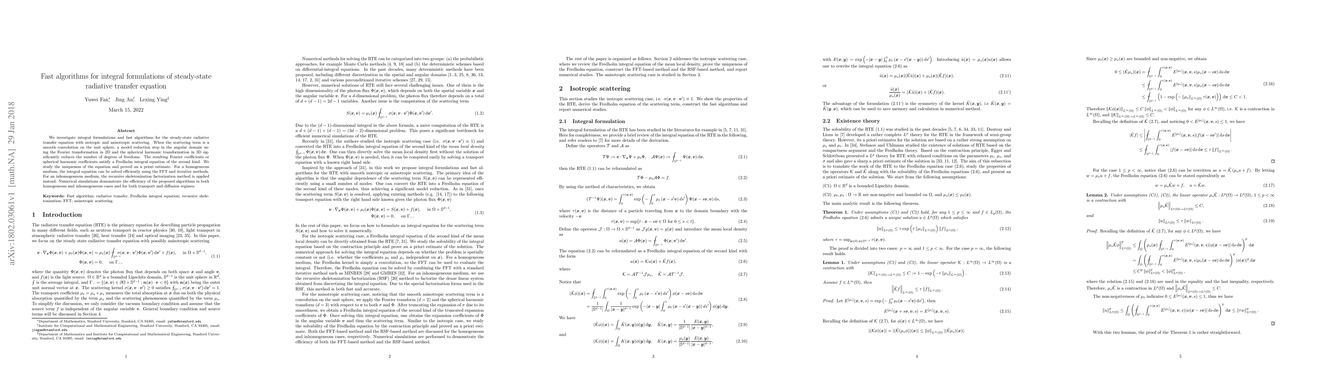 This paper develops fast algorithms for solving integral formulations of the steady-state radiative transfer equation, utilizing Fourier and spherical harmonic transformations to reduce complexity. It presents efficient solutions for both homogeneous and inhomogeneous media, validated through numerical simulations.