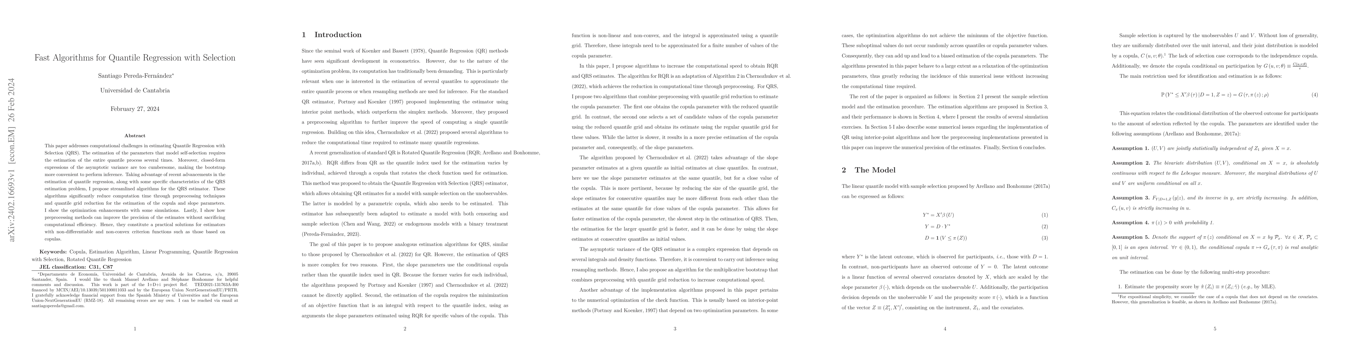 This paper proposes fast algorithms to efficiently estimate Quantile Regression with Selection (QRS), addressing computational challenges through preprocessing and quantile grid reduction. The new methods significantly reduce computation time and improve precision without sacrificing efficiency, offering practical solutions for non-differentiable and non-convex criterion functions.