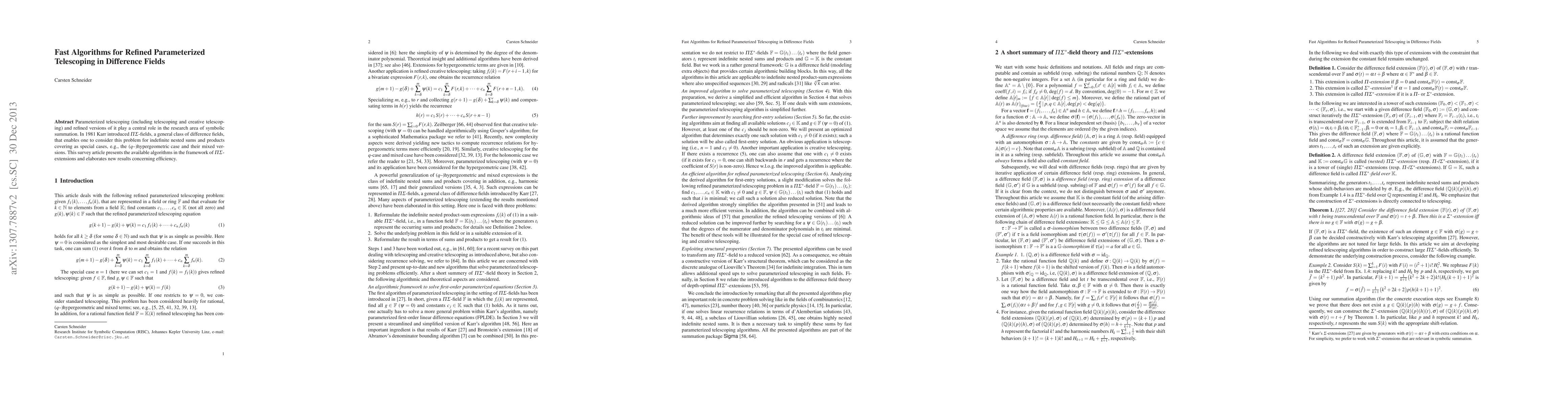 Parameterized telescoping (including telescoping and creative telescoping) and refined versions of it play a central role in the research area of symbolic summation. Karr introduced 1981 $\Pi\Sigma$-fields, a general class of difference fields, that enables one to consider this problem for indefinite nested sums and products covering as special cases, e.g., the ($q$--)hypergeometric case and their mixed versions. This survey article presents the available algorithms in the framework of $\Pi\Sigma$-extensions and elaborates new results concerning efficiency.