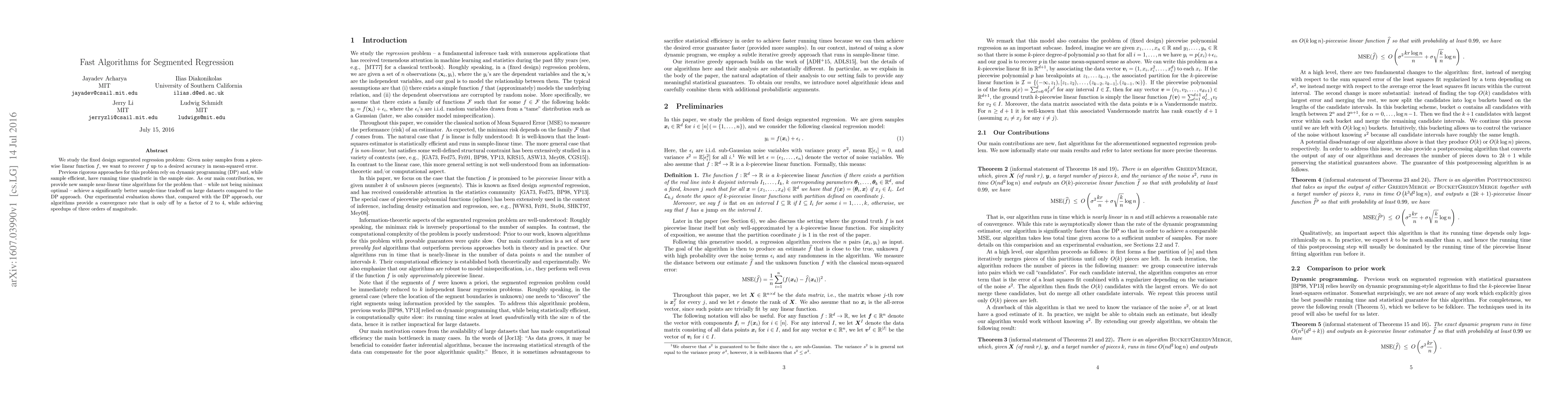 New algorithms for segmented regression offer a faster sample-time tradeoff than dynamic programming, achieving speedups of three orders of magnitude while only deviating in convergence rate by a factor of 2 to 4.