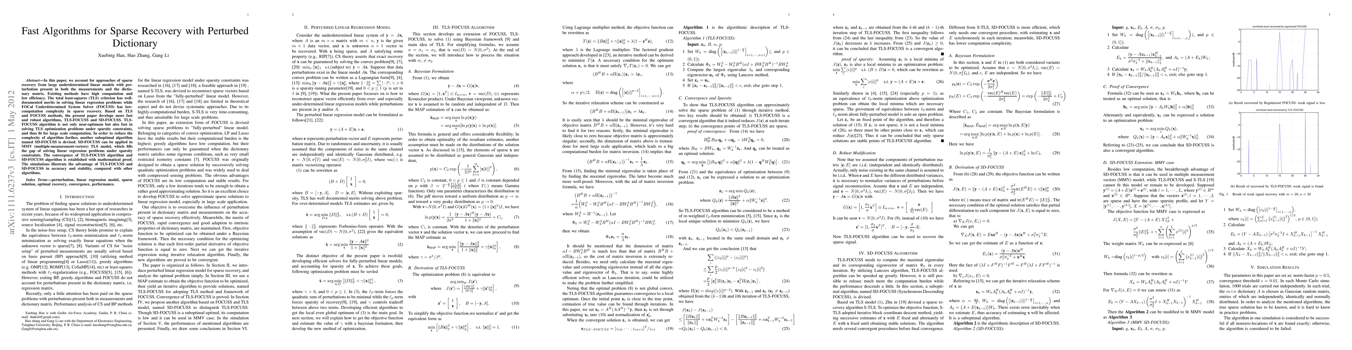This paper develops fast and efficient algorithms for sparse recovery in underdetermined linear models with measurement and dictionary perturbations. The proposed TLS-FOCUSS and SD-FOCUSS algorithms outperform existing methods in terms of speed, accuracy, and stability, with mathematical proofs of their convergence.