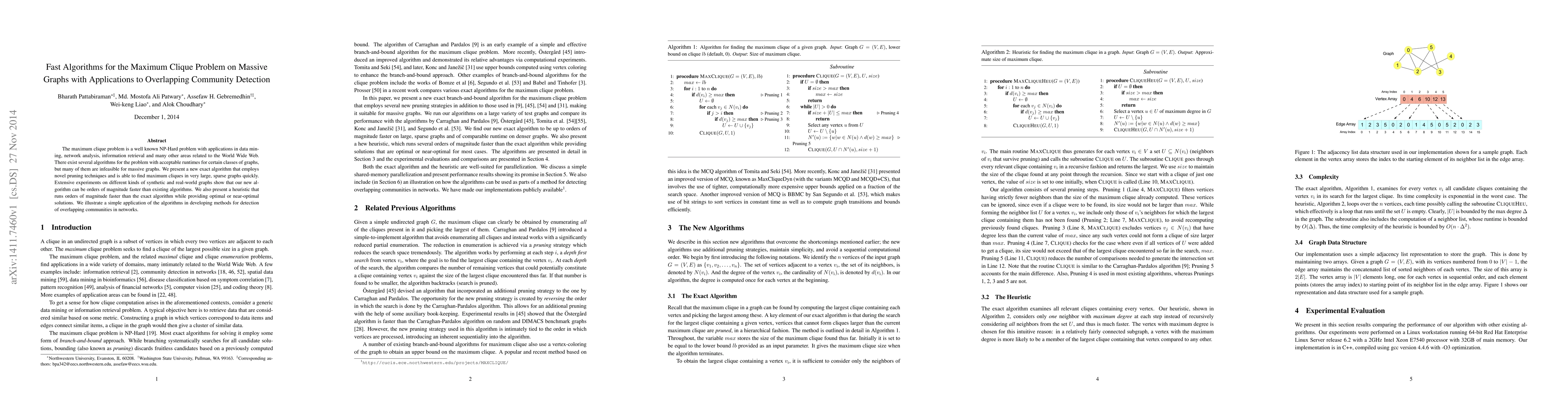 This paper introduces a new exact algorithm for solving the NP-Hard maximum clique problem efficiently on massive graphs, employing novel pruning techniques. It also presents a faster heuristic, both of which are demonstrated to outperform existing methods, with applications to overlapping community detection in networks.