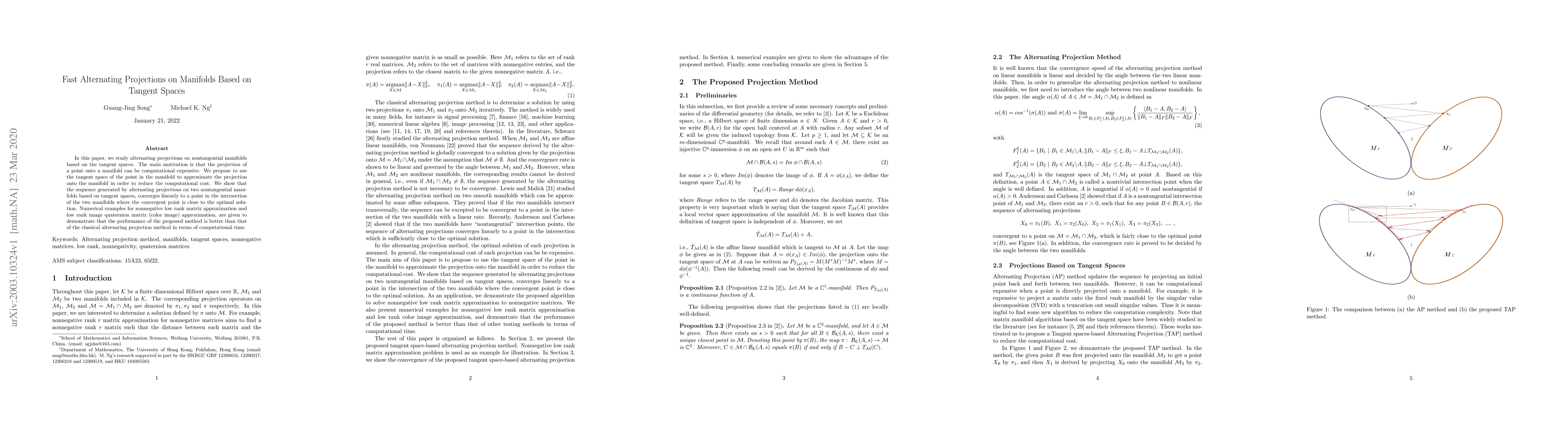 In this paper, we study alternating projections on nontangential manifolds based on the tangent spaces. The main motivation is that the projection of a point onto a manifold can be computational expensive. We propose to use the tangent space of the point in the manifold to approximate the projection onto the manifold in order to reduce the computational cost. We show that the sequence generated by alternating projections on two nontangential manifolds based on tangent spaces, converges linearly to a point in the intersection of the two manifolds where the convergent point is close to the optimal solution. Numerical examples for nonnegative low rank matrix approximation and low rank image quaternion matrix (color image) approximation, are given to demonstrate that the performance of the proposed method is better than that of the classical alternating projection method in terms of computational time.