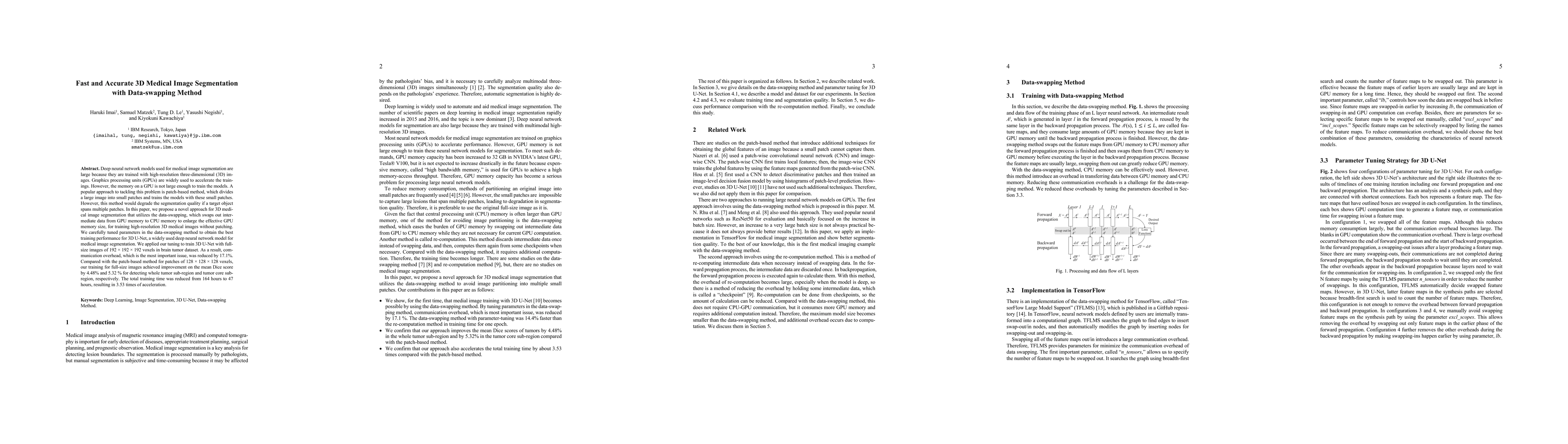 Deep neural network models used for medical image segmentation are large because they are trained with high-resolution three-dimensional (3D) images. Graphics processing units (GPUs) are widely used to accelerate the trainings. However, the memory on a GPU is not large enough to train the models. A popular approach to tackling this problem is patch-based method, which divides a large image into small patches and trains the models with these small patches. However, this method would degrade the segmentation quality if a target object spans multiple patches. In this paper, we propose a novel approach for 3D medical image segmentation that utilizes the data-swapping, which swaps out intermediate data from GPU memory to CPU memory to enlarge the effective GPU memory size, for training high-resolution 3D medical images without patching. We carefully tuned parameters in the data-swapping method to obtain the best training performance for 3D U-Net, a widely used deep neural network model for medical image segmentation. We applied our tuning to train 3D U-Net with full-size images of 192 x 192 x 192 voxels in brain tumor dataset. As a result, communication overhead, which is the most important issue, was reduced by 17.1%. Compared with the patch-based method for patches of 128 x 128 x 128 voxels, our training for full-size images achieved improvement on the mean Dice score by 4.48% and 5.32 % for detecting whole tumor sub-region and tumor core sub-region, respectively. The total training time was reduced from 164 hours to 47 hours, resulting in 3.53 times of acceleration.