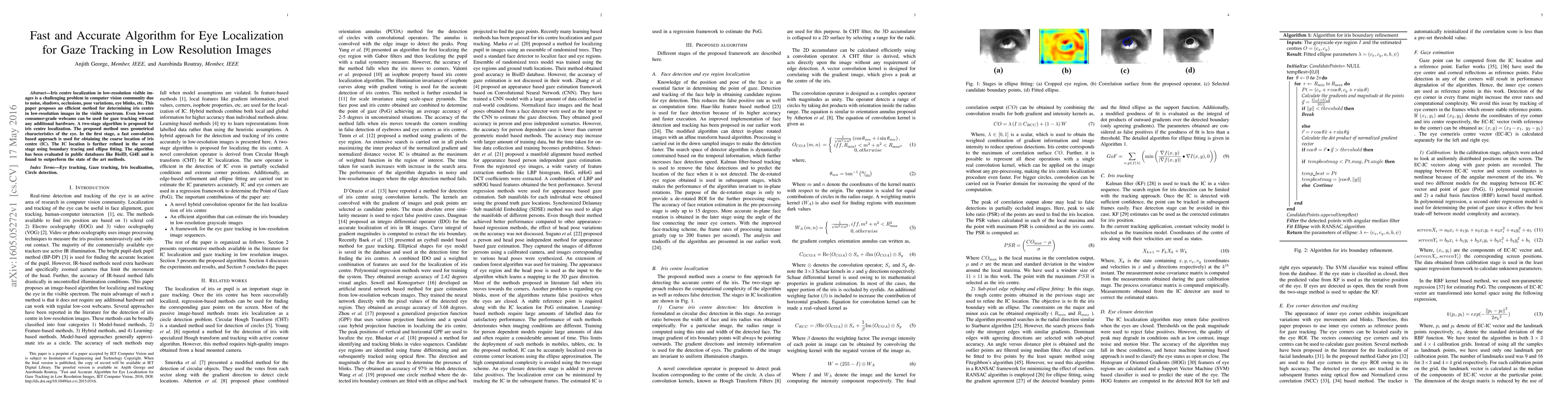 This paper proposes a two-stage algorithm for iris center localization in low-resolution images, using a fast convolution-based approach for coarse location followed by boundary tracing and ellipse fitting for refinement. The method outperforms existing techniques, enabling gaze tracking with low-cost webcams.