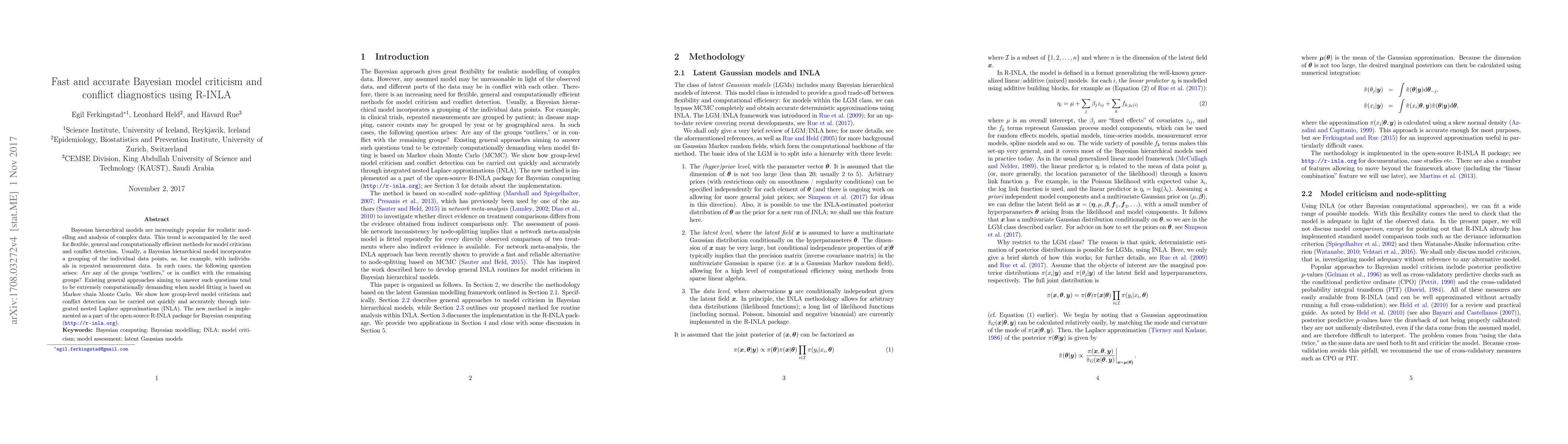 This paper presents a fast and accurate method for Bayesian model criticism and conflict diagnostics using integrated nested Laplace approximations (INLA), implemented in the R-INLA package, to efficiently detect group-level outliers or conflicts in hierarchical Bayesian models. The proposed approach offers a computationally efficient alternative to traditional MCMC-based methods.