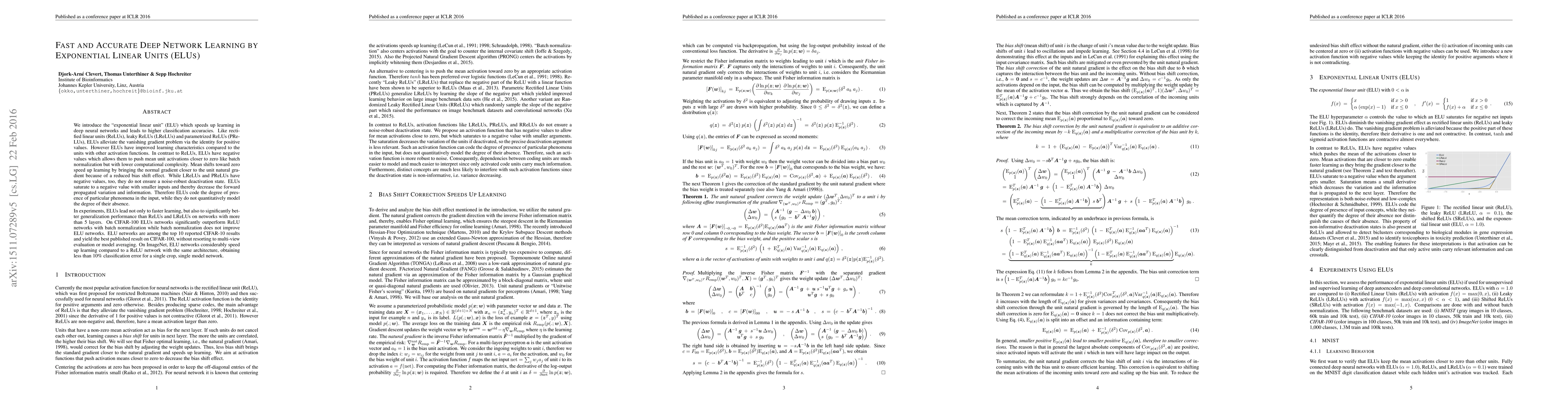 We introduce the "exponential linear unit" (ELU) which speeds up learning in deep neural networks and leads to higher classification accuracies. Like rectified linear units (ReLUs), leaky ReLUs (LReLUs) and parametrized ReLUs (PReLUs), ELUs alleviate the vanishing gradient problem via the identity for positive values. However, ELUs have improved learning characteristics compared to the units with other activation functions. In contrast to ReLUs, ELUs have negative values which allows them to push mean unit activations closer to zero like batch normalization but with lower computational complexity. Mean shifts toward zero speed up learning by bringing the normal gradient closer to the unit natural gradient because of a reduced bias shift effect. While LReLUs and PReLUs have negative values, too, they do not ensure a noise-robust deactivation state. ELUs saturate to a negative value with smaller inputs and thereby decrease the forward propagated variation and information. Therefore, ELUs code the degree of presence of particular phenomena in the input, while they do not quantitatively model the degree of their absence. In experiments, ELUs lead not only to faster learning, but also to significantly better generalization performance than ReLUs and LReLUs on networks with more than 5 layers. On CIFAR-100 ELUs networks significantly outperform ReLU networks with batch normalization while batch normalization does not improve ELU networks. ELU networks are among the top 10 reported CIFAR-10 results and yield the best published result on CIFAR-100, without resorting to multi-view evaluation or model averaging. On ImageNet, ELU networks considerably speed up learning compared to a ReLU network with the same architecture, obtaining less than 10% classification error for a single crop, single model network.