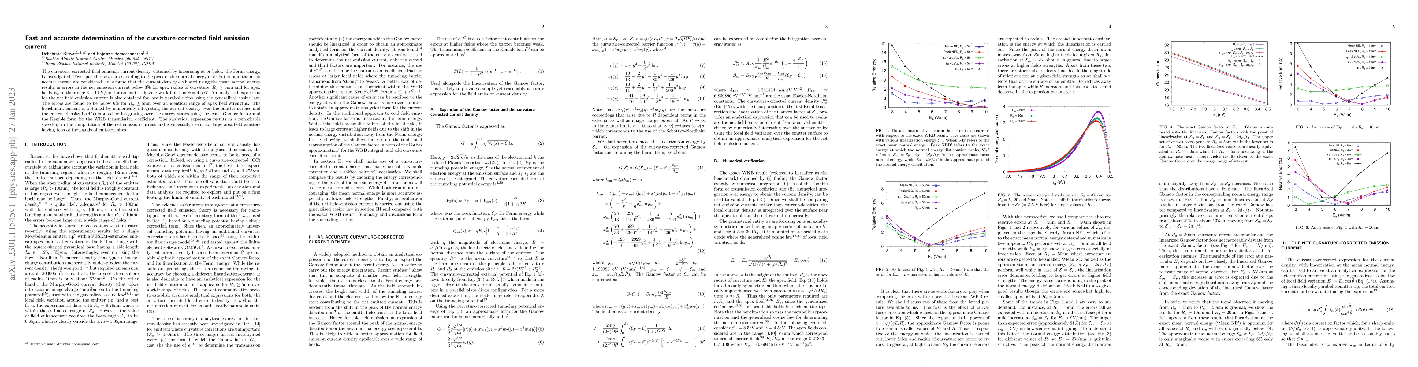 The curvature-corrected field emission current density, obtained by linearizing at or below the Fermi energy, is investigated. Two special cases, corresponding to the peak of the normal energy distribution and the mean normal energy, are considered. It is found that the current density evaluated using the mean normal energy results in errors in the net emission current below 3% for apex radius of curvature, $R_a \geq 5$nm and for apex fields $E_a$ in the range $3-10$ V/nm for an emitter having work-function $\phi = 4.5$eV. An analytical expression for the net field emission current is also obtained for locally parabolic tips using the generalized cosine law. The errors are found to be below 6% for $R_a \geq 5$nm over an identical range of apex field strengths. The benchmark current is obtained by numerically integrating the current density over the emitter surface and the current density itself computed by integrating over the energy states using the exact Gamow factor and the Kemble form for the WKB transmission coefficient. The analytical expression results in a remarkable speed-up in the computation of the net emission current and is especially useful for large area field emitters having tens of thousands of emission sites.